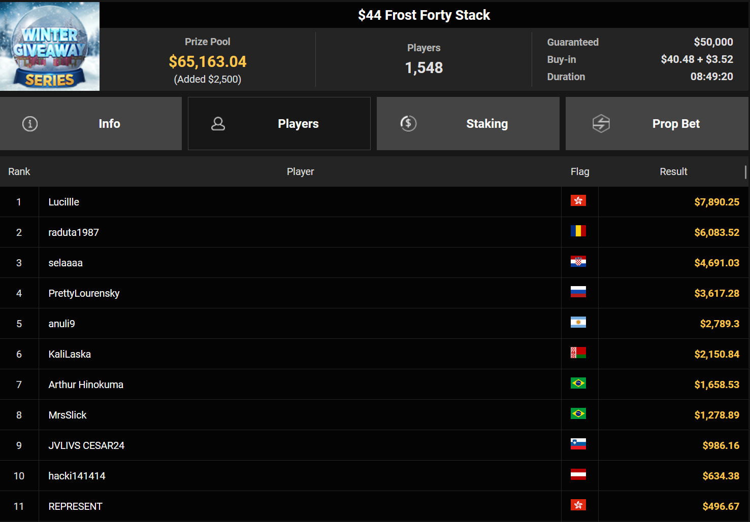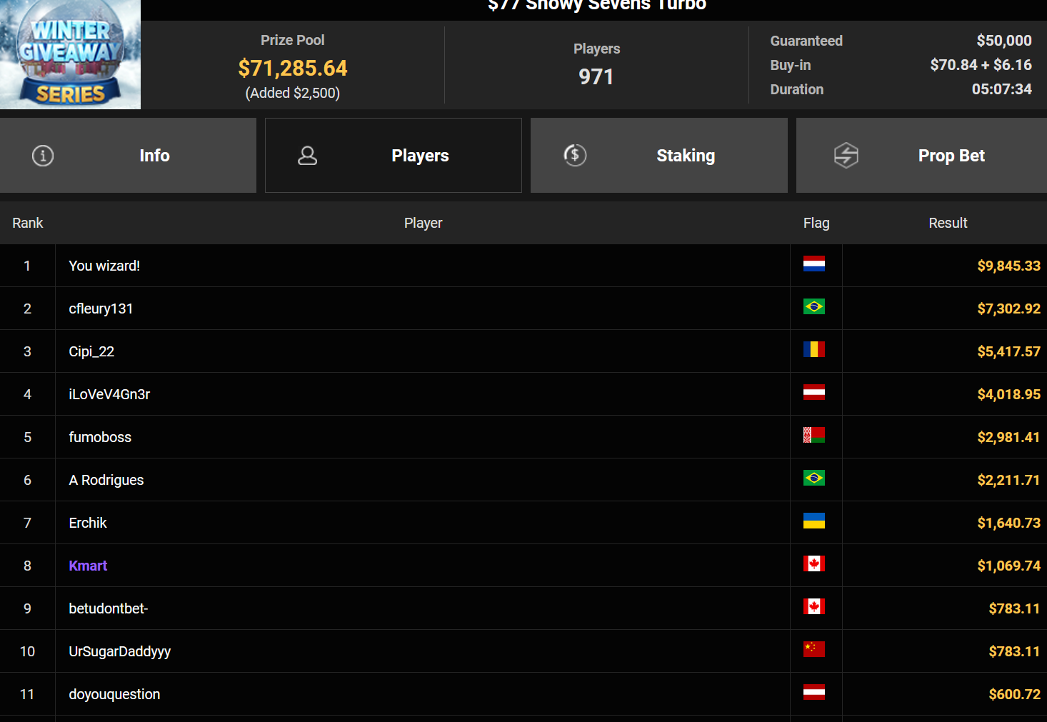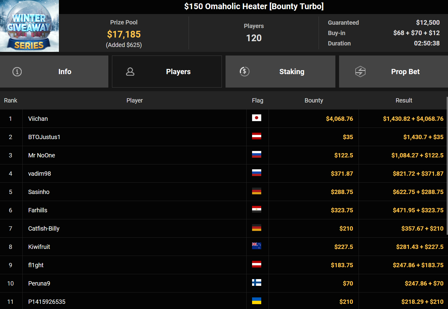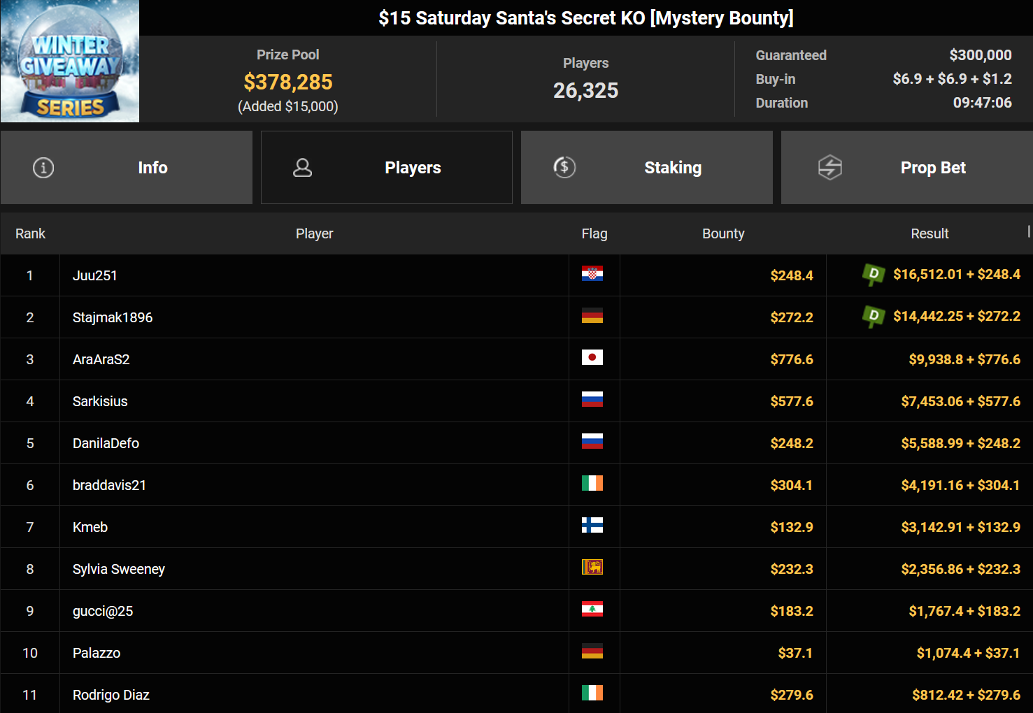 Stajmak1896 wurde beim $15 Santas Secret KO Runner-up für $14.442 + $272, josch2001 belegte beim $108 Omaholic Daily Main Rang 3 für $1.548 + $995.