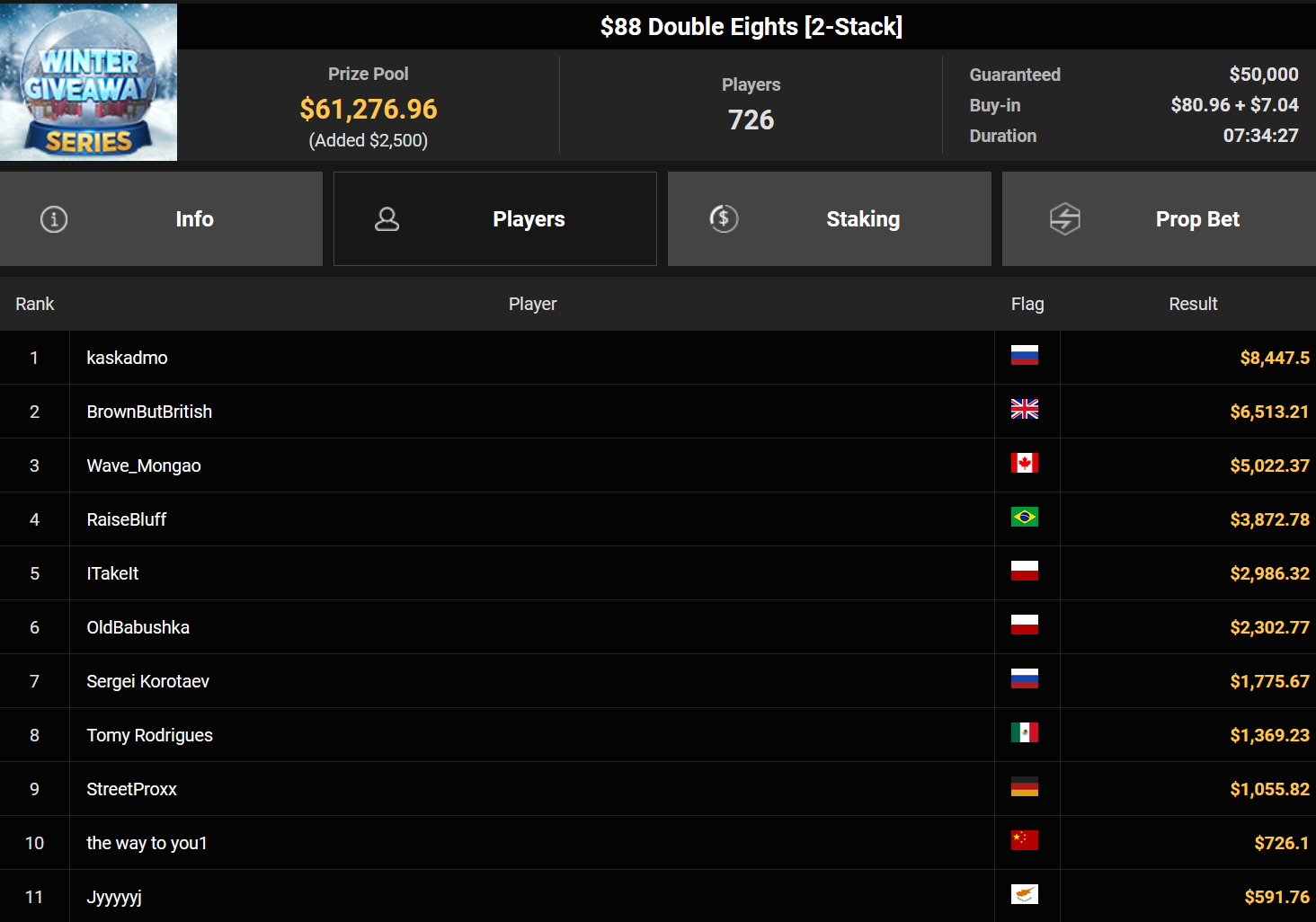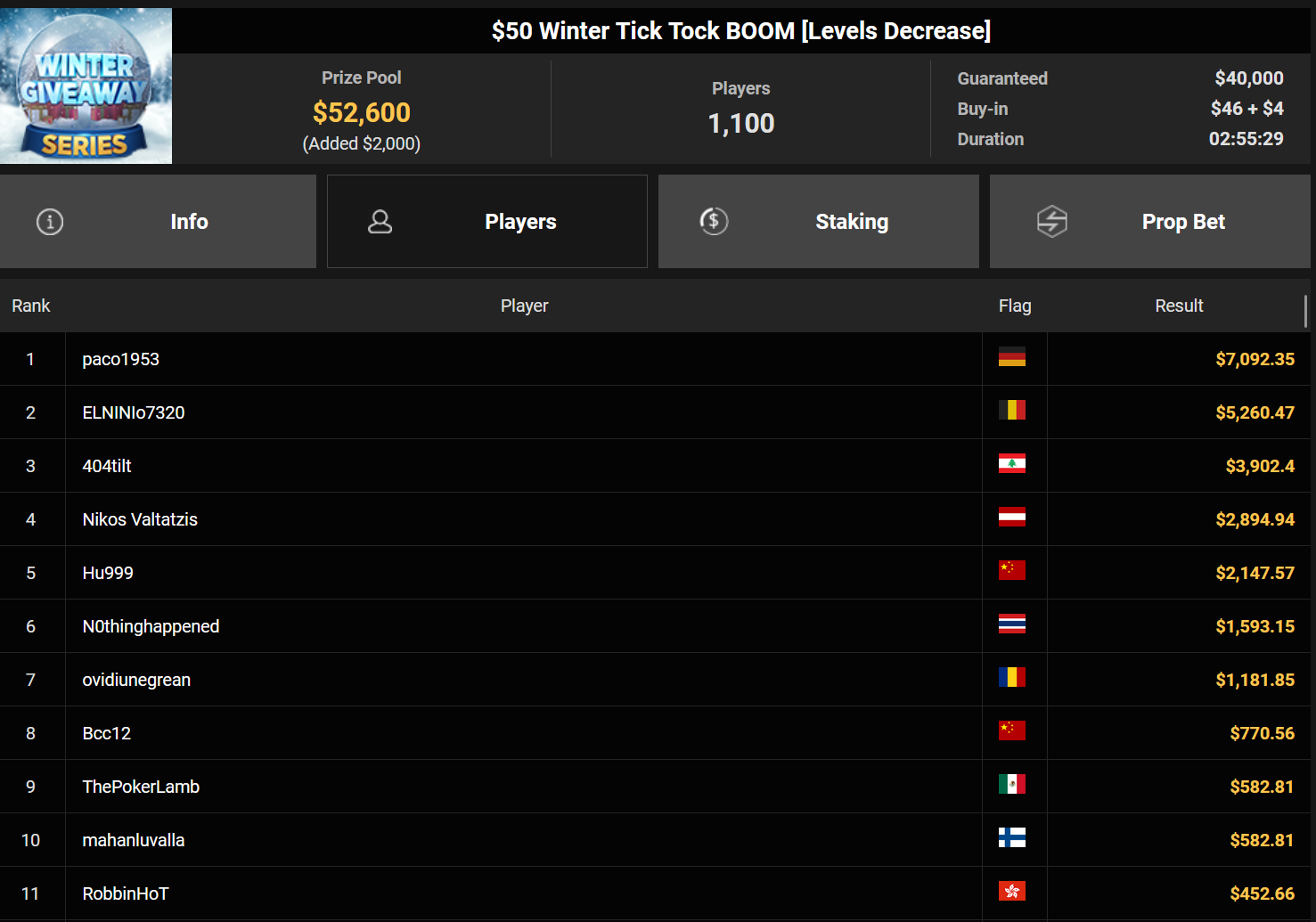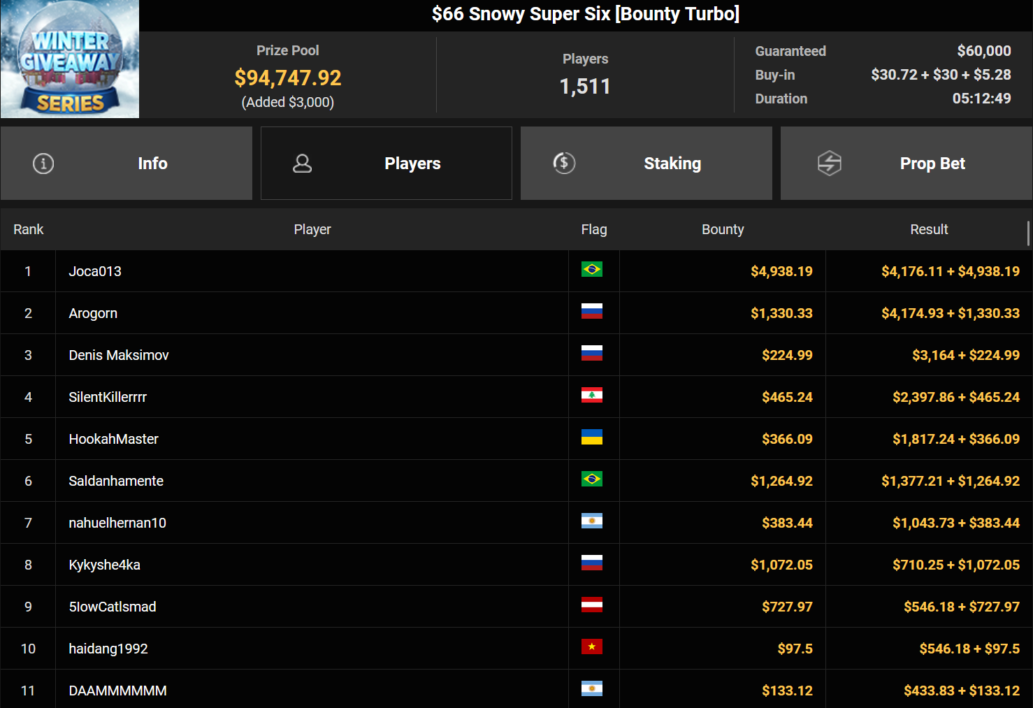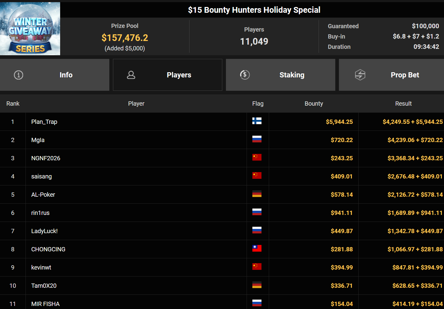 Stajmak1896 wurde beim $15 Santas Secret KO Runner-up für $14.442 + $272, josch2001 belegte beim $108 Omaholic Daily Main Rang 3 für $1.548 + $995.