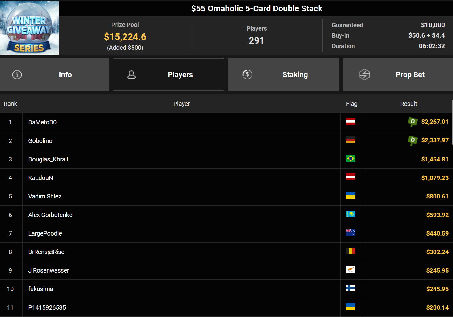 DaMetoD0 (1/$2.267) und Gobolino (2/$2.337) feierten den Doppelsieg beim $55 Omaholic 5-Card Double Stack, Dax_The_Law war beim $54 Saturday Icebreaker für $8.366 + $10.436 erfolgreich.