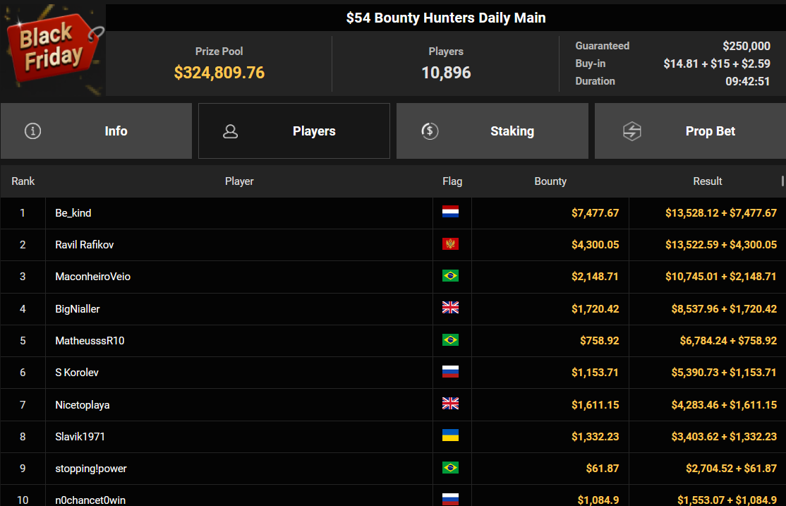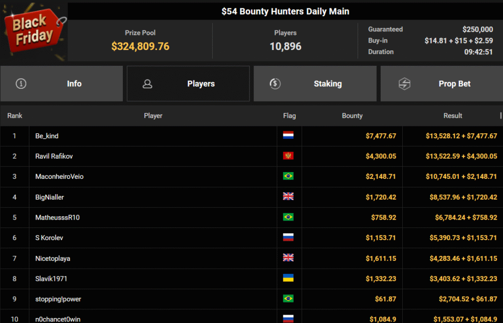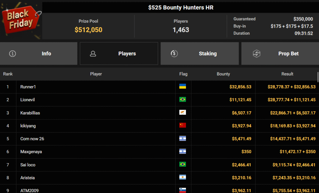 Das $14,81 + 15 + 2,59 Bounty Hunters Daily Main hatte neuerlich 10.896 Entries und so kam man auf einen Preispool von $324.809, auch beim $175 + 175 + 17,5 Bounty Hunters HR schaffteeman mit 1.463 Entries einen massiven Preispool von $512.050.