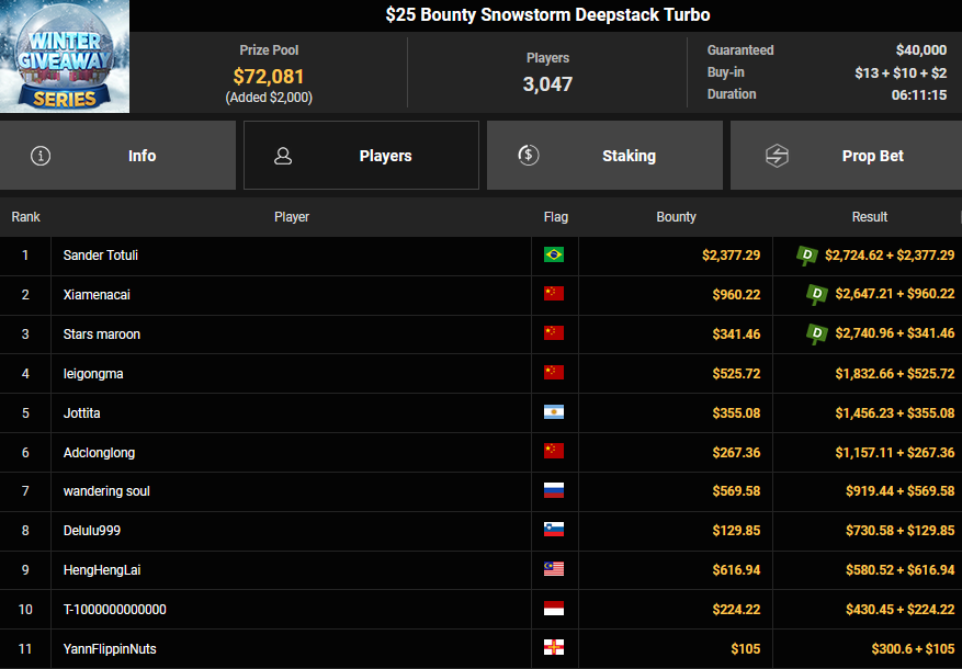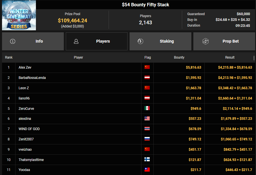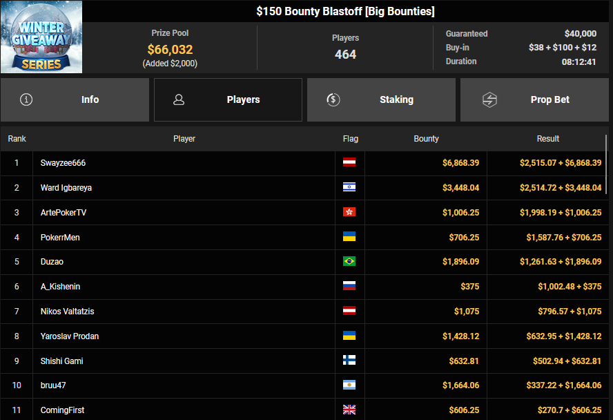 Swayzee666 startete mit einem Sieg beim $150 Bounty Blastoff ($2.515 + $6.868), BarbaRossaLenda wurde beim $54 Bounty Fifty Stack Runner-up für $4.213 + $1.595, liano96 konnte noch $2.660 + 41.311 für Rang 4 mitnehmen.