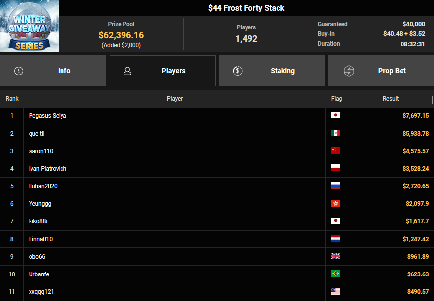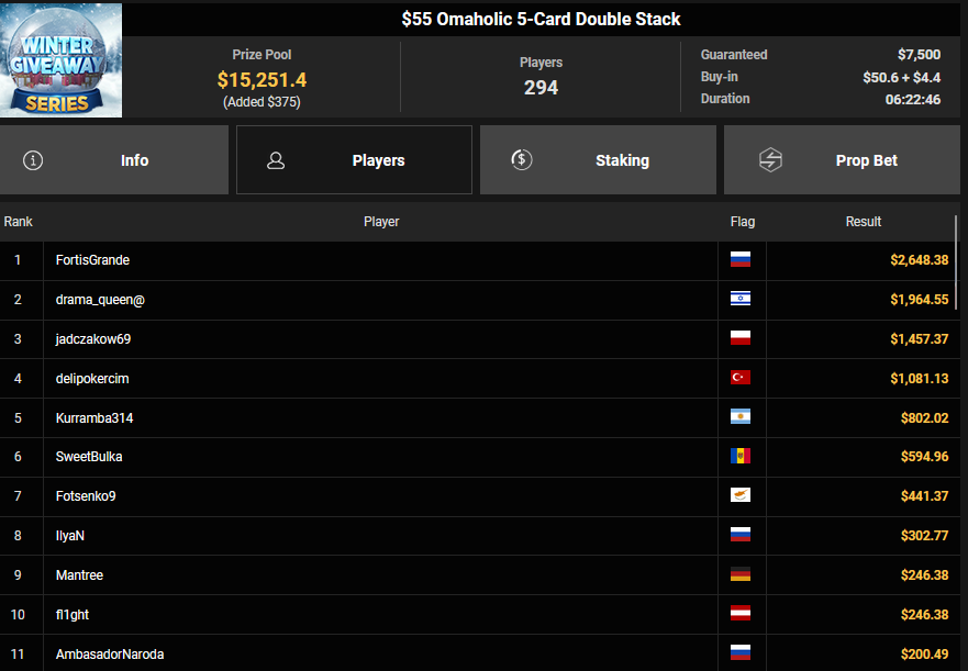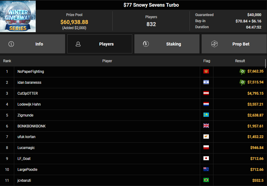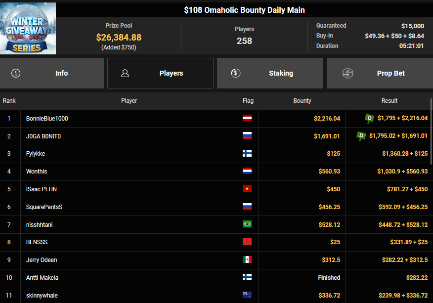 GG!Joker kam als bester Deutscher beim $15 Friday Fisticuffs auf Rang 3 ($3.353 + $1.900), auch CD-SSK wurde Dritter beim $150 Friday Fisticuffs ($7.226 + $1.509). BonnieBlue1000 schnappte sich den Sieg beim $108 Omaholic Bounty Daily Main für $1.795 + $2.216, Cut3pOTTER belegte beim $77 Snowy Sevens Rang 3 für $4.795.