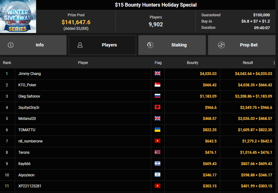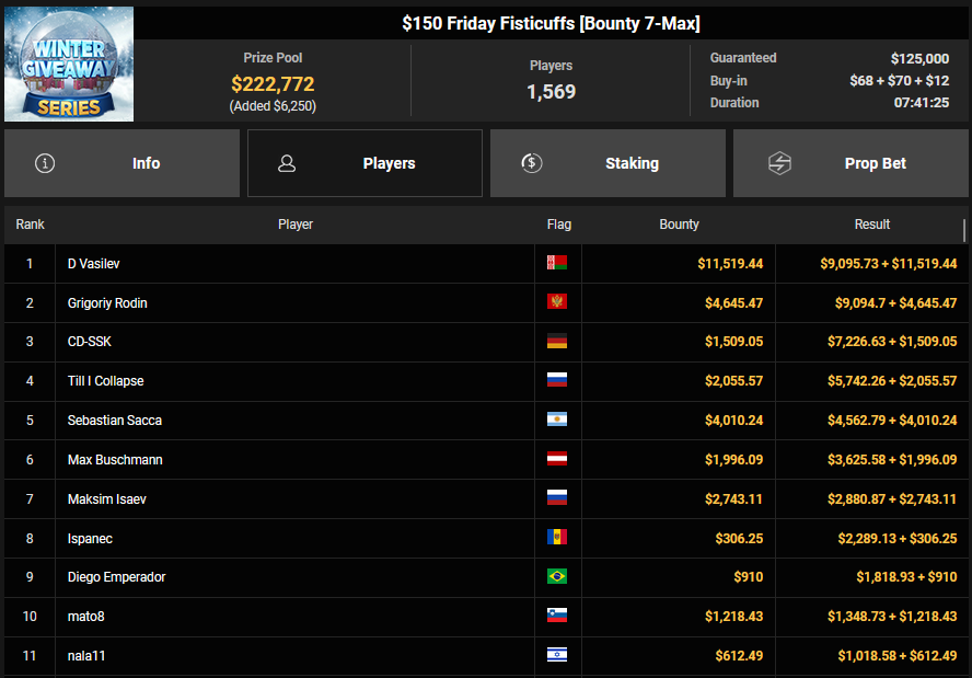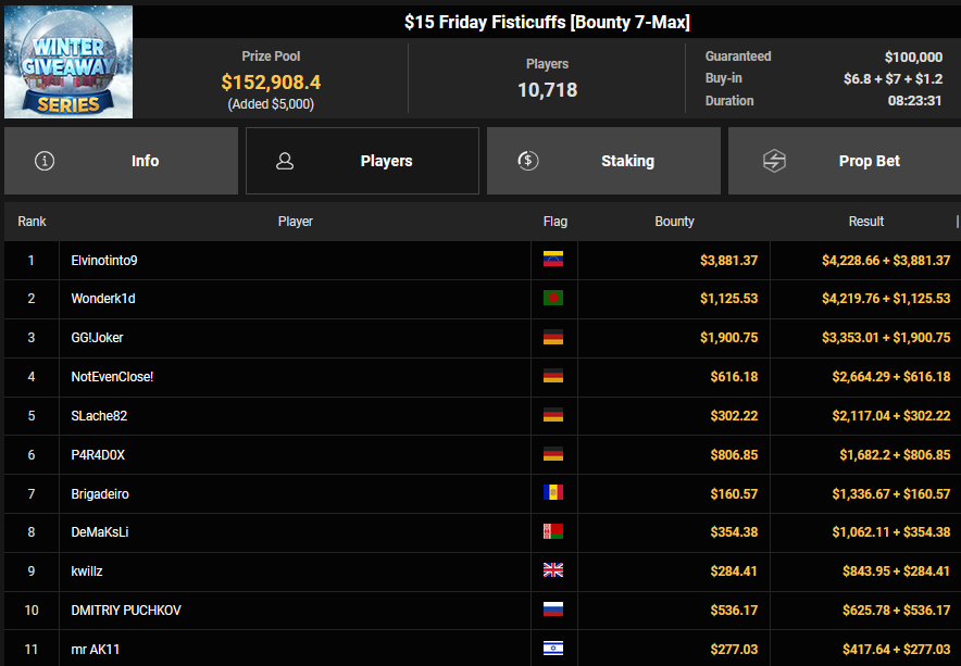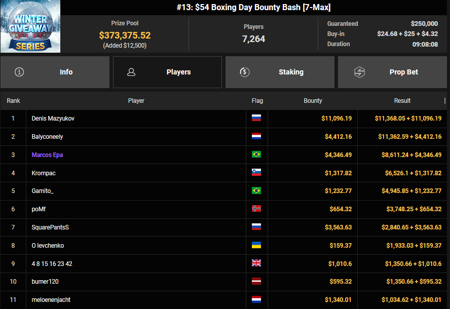 Chris Rudolph kam beim $215 Bounty Hunters Winter Games auf Rang 3, was ihm $5.213 + $2.857 bescherte. Leider keine deutschsprachige Beteiligung am Final Table gab es beim $54 Boxing Day Bounty Bash. Das Turnier brachte es auf gleich 7.264 Entries und damit einen Preispool von $373.375, der Sieger Denis Mazyukov kassierte $11.368 + $11.096.