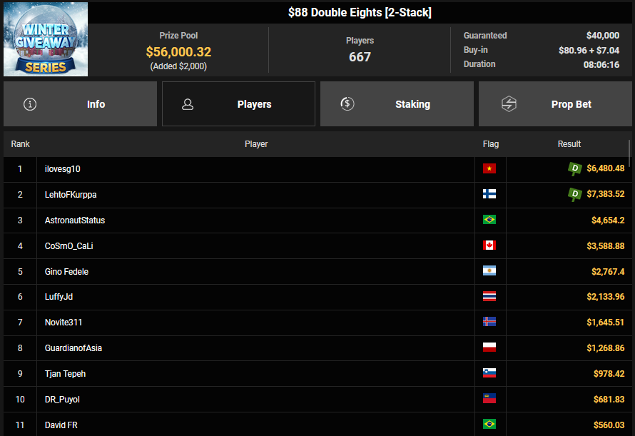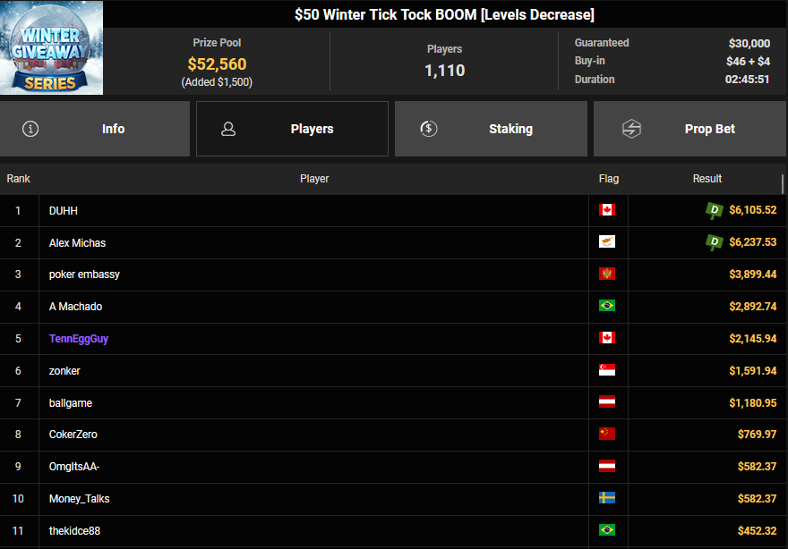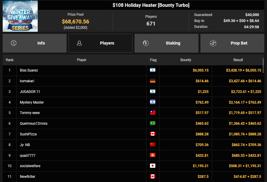 Zu später Stunde war komakarl noch hellwach und sicherte sich Platz 2 beim $108 Holiday Heater, was ihm $3.247 + $614 bescherte.