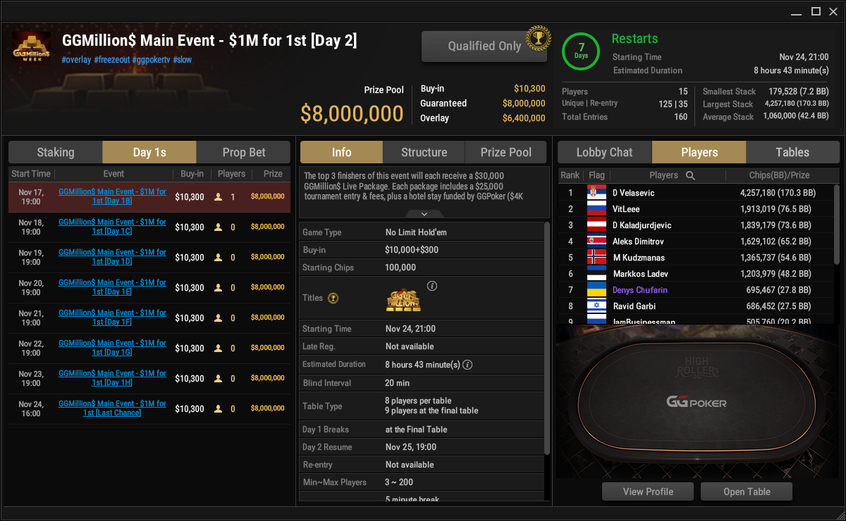 Über die vielen Satellites habt Ihr gute Chancen, Euch für die High Roller Turniere zu qualifizieren. Alle Turniere und auch die dazugehörigen Satellites findet Ihr wie immer im eigenen GGMillion$ Tab im Client, weitere Infos findet Ihr auf den Seiten von GGPoker.