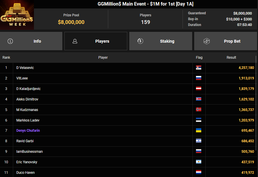 Das $10.300 GGMillion$ Main Event kommt mit $8.000.000 GTD, der erste Flight gestern lockte bereits 160 Entris (125/35) an. Die DACHs waren natürlich am Start, ganz vorn ekonnte aber keiner mitmischen. 15 Spieler qualifizierten sich für Tag 2 am 24. November, Chris Nguyen liegt als bester deutschsprachiger Spieler auf Rang 12. Acht Flights bis zum Montag werden noch angeboten.