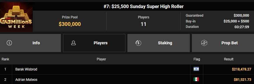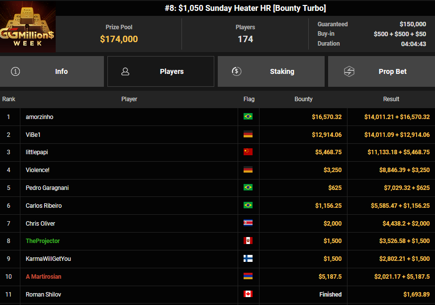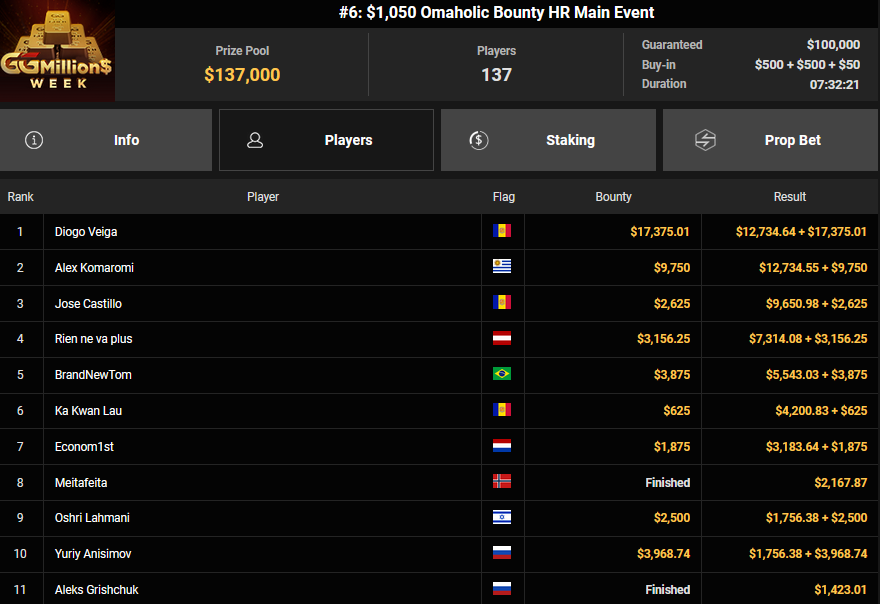 Starke Zahlen hatte der Auftakt der GGMillion$ Week auf alle Fälle. So wurde auch die $2.000.000 Garantie beim $525 Super Kickoff Bounty Hunters HR mit 4.263 Entries locker übertroffen. Diego Zeiter schaffte es als letzter DACH-Spieler an den Final Table, im Heads-up unterlag er aber enolagay und musste sich mit Rang 2 und $104.458 + $18.175 trösten. enolagay kassierte $104.460 + $71.775.