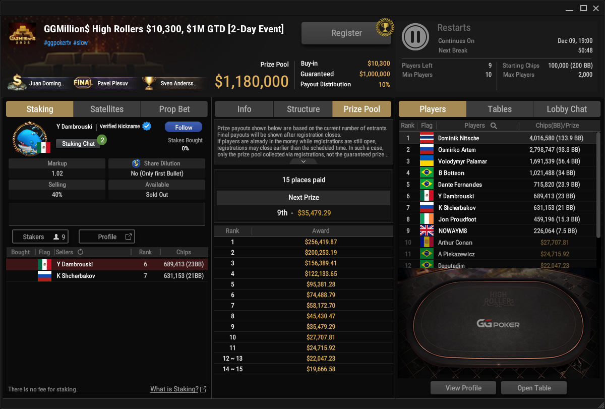 Vor allem die High Roller sind aktuell auf den verschiedenen Kontinenten aufgeteilt und im Live-Einsatz. Dennoch waren es 118 Entries beim $10k GGMillion$. Die top 15 Plätze waren bezahlt, wobei von den DACHs nur Dominik Nitsche die Geldränge erreichen konnte. Er holte sich dann aber auch gleich den Chiplead für das Finale der letzten neun, wo $256.419 auf den Sieger warten. Die Entscheidung fällt morgen Abend.