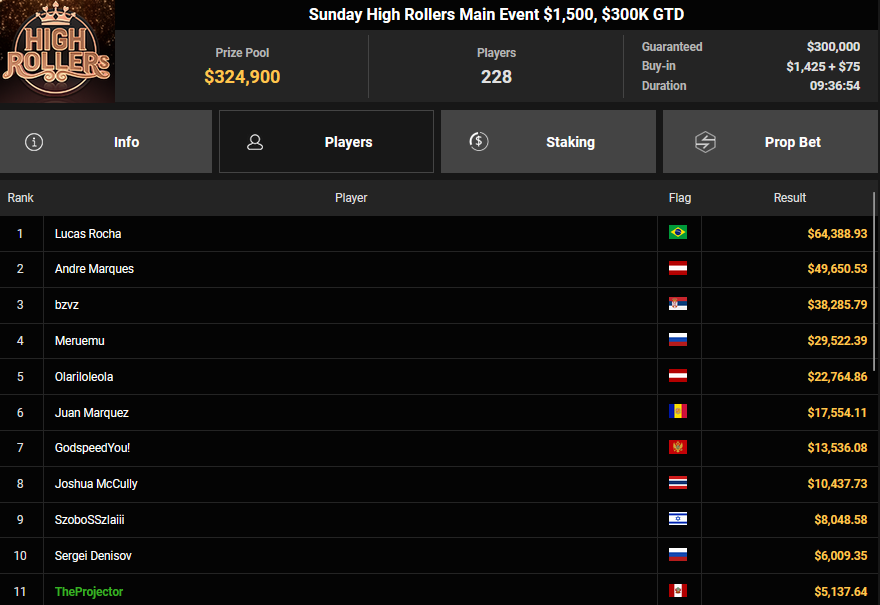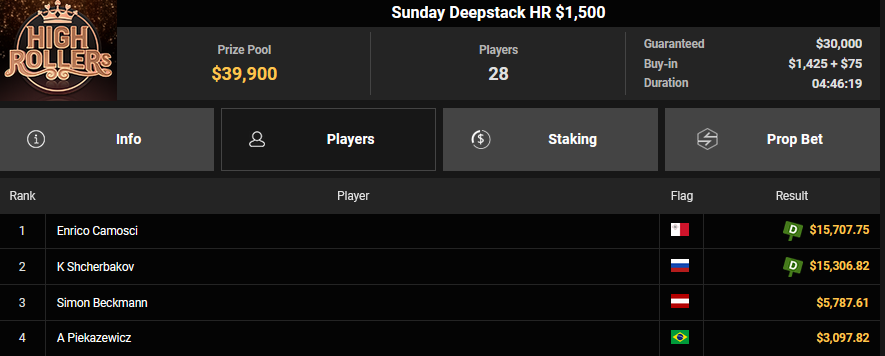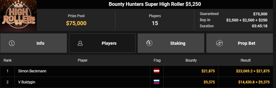 Allzu groß waren die Felder bei den High Rollern nicht, Simon Beckmann konnte beim $1.500 Sunday Deepstack Rang 3 für $5.787 mitnehmen und sicherte sich den Sieg beim $5.250 Bounty Hunters SHR für $23.069 + $21.875.