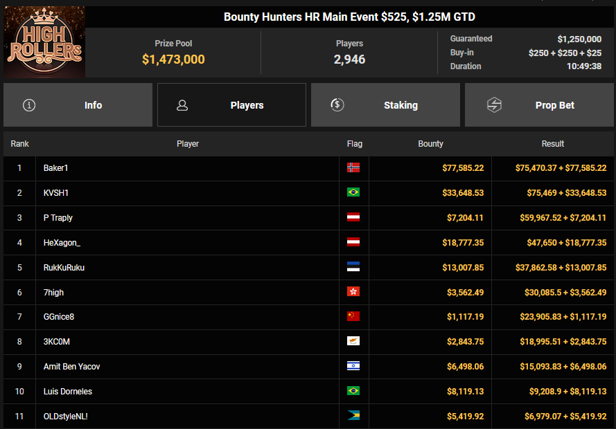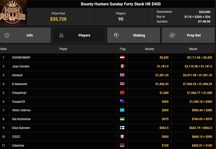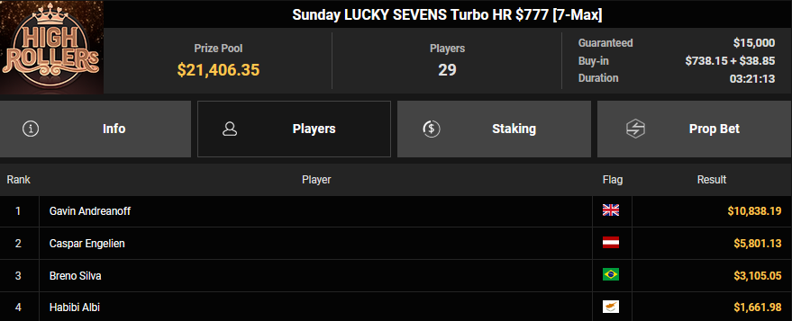 GG!!G0H0M3!! holte das $400 Bounty Hunters Forty Stack für $3.111 + $5.425, Caspar Engelien wurde beim $777 Lucky Sevens Turbo Runner-up für $5.801.
