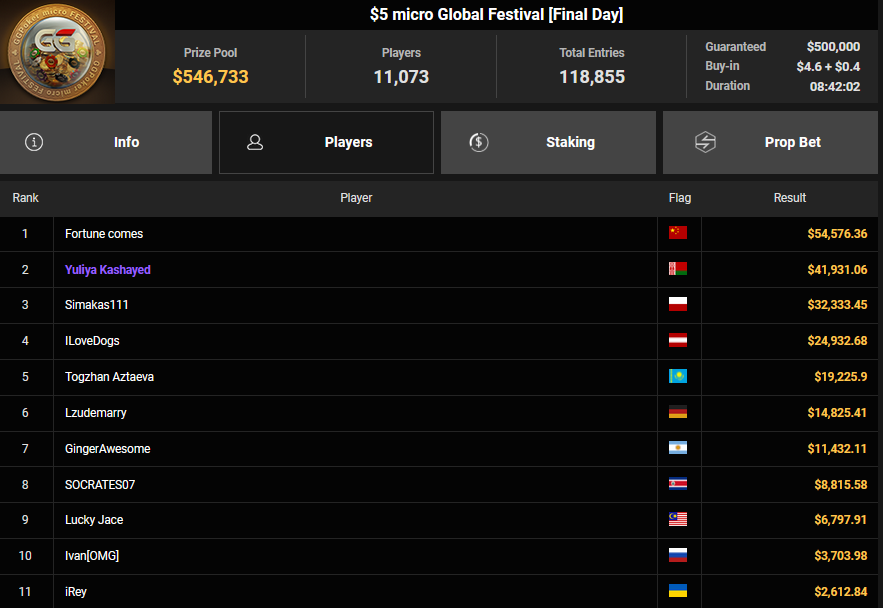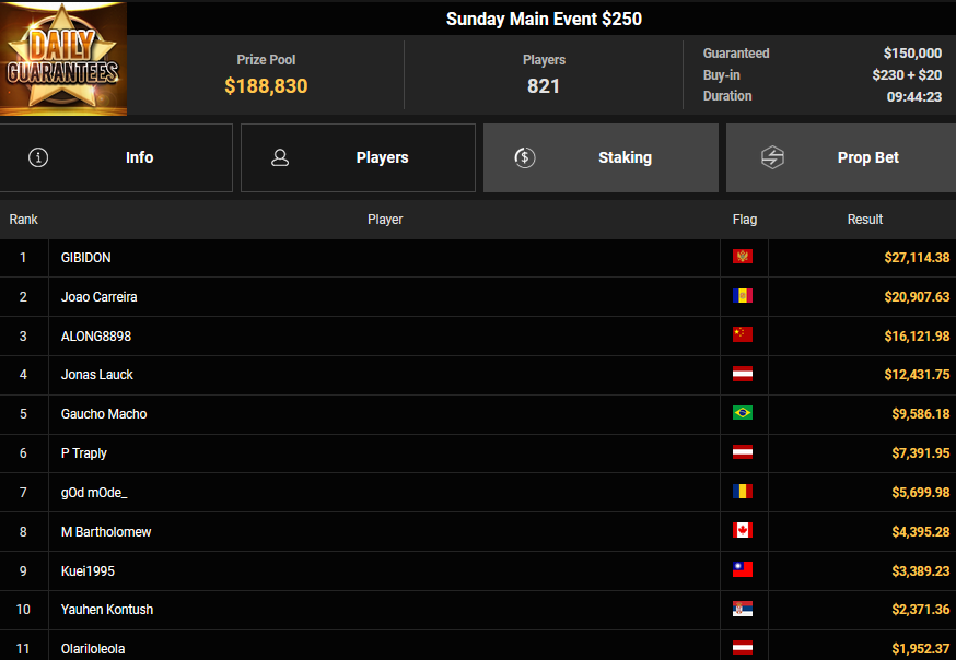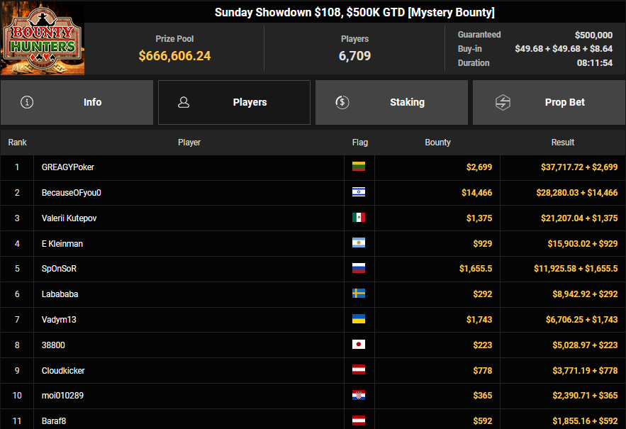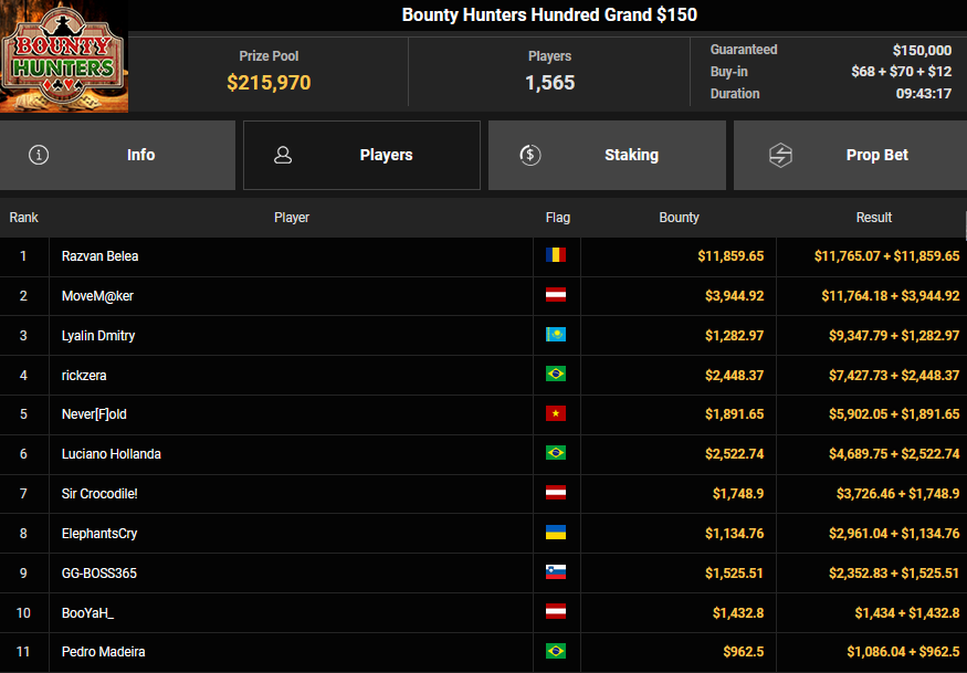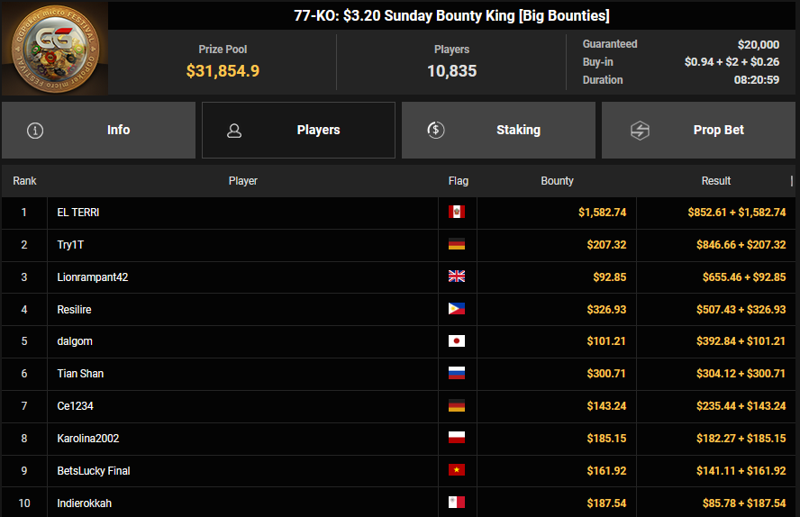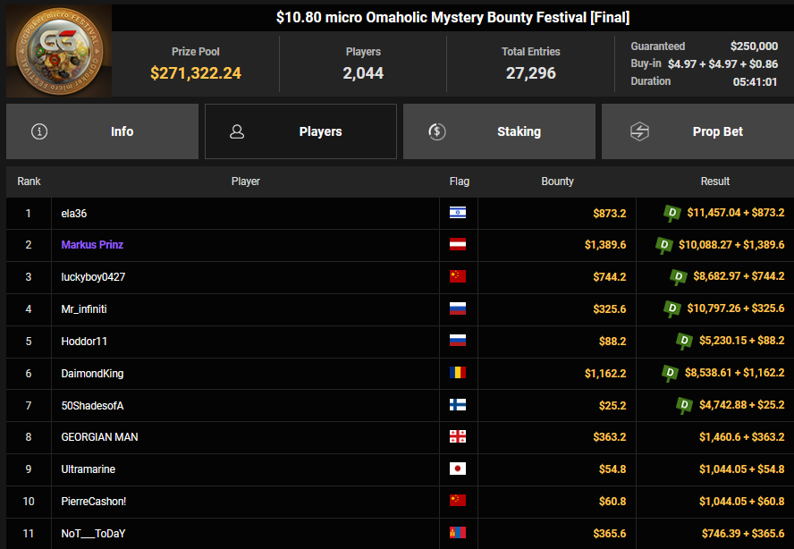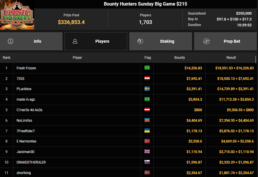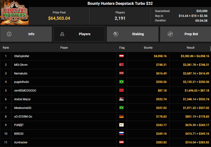 Aus nur $5 konnte ILoveDogs beim $5 Micro Global Festival satte $24.932 für Rang 4 machen, Lzudemarry kam auf Rang 6 und kassierte $14.825. Try1T wurde beim $3,20 Sunday Bounty King Runner-up für $846 + $207, auch markus Prinz verpasste den Sieg beim $10,80 Micro Omaholic Mystery Bounty ($10.088 + $1.389). VieKush wurde beim $44 Bounty Hunters Freezeout Runner-up für $8.930 + $2.284. GtaExploiter konnte den Sieg beim $32 Bounty Hunters Deepstack für $3.382 + $4.058 holen, 7353 wurde beim $215 Bounty Hunters Big Game Runner-up für $18.550 + $7.692.