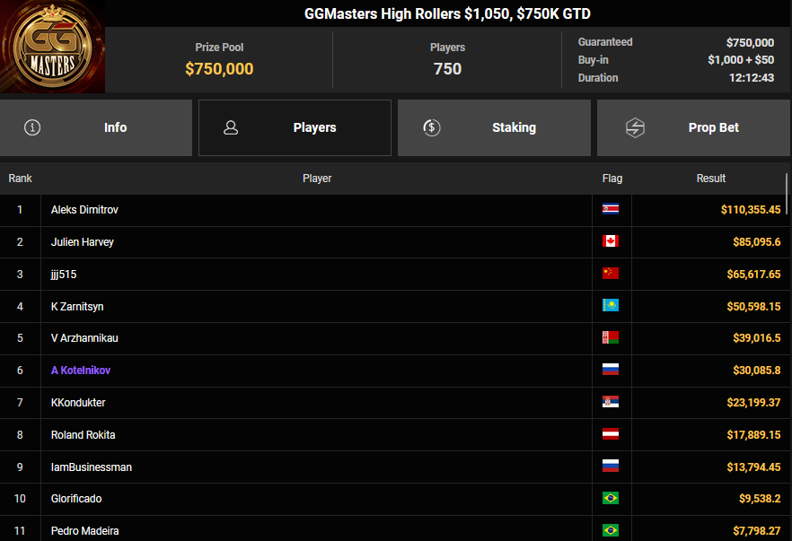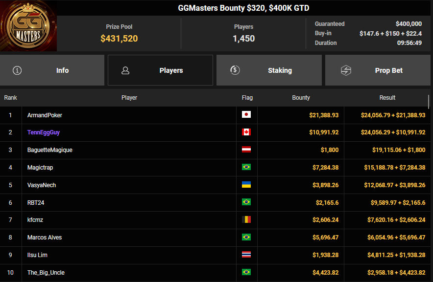 MoveM@ker verpasste beim $150 Hundred Grand den Sieg ($11.764+ $3.944), Jonas Lauck kassierte $12.431 für Platz 4 beim $250 Sunday main Event. BaguetteMagique belegte beim $320 GGMasters Bounty Rang 3 für $19.115 + $1.800.