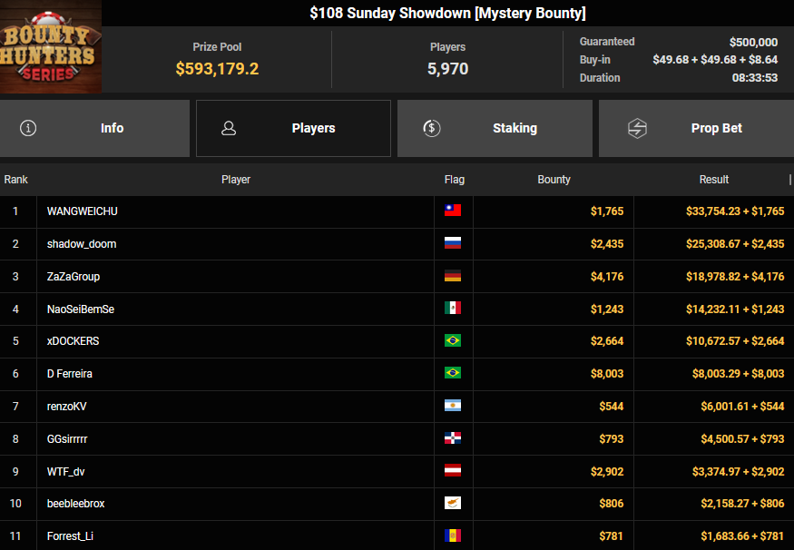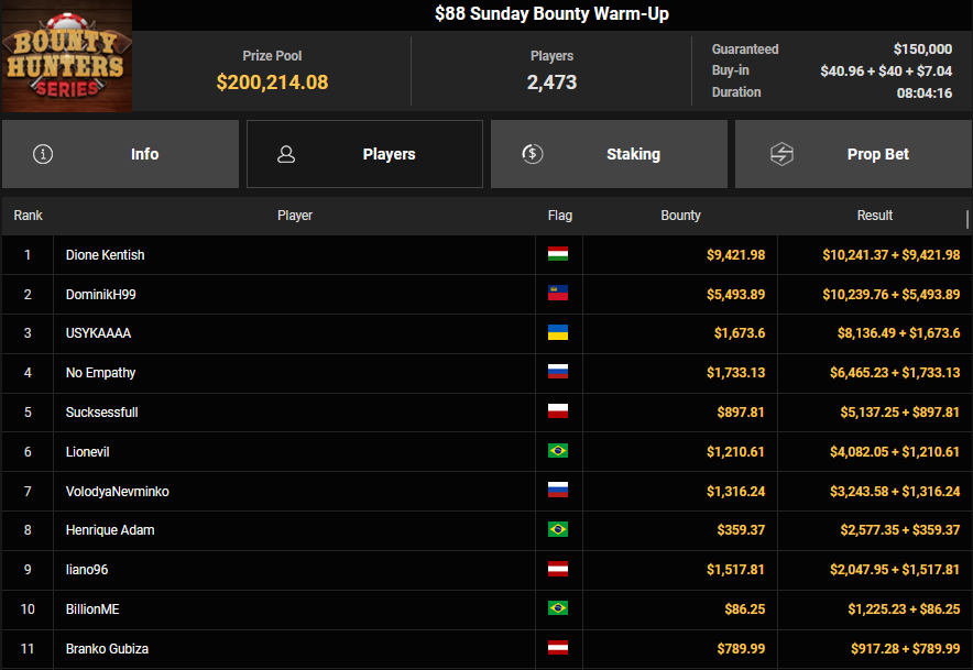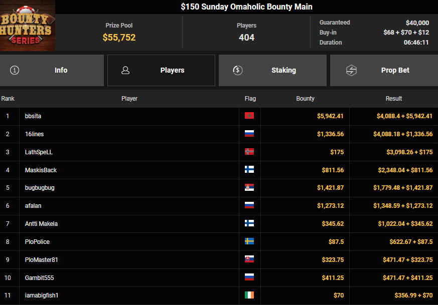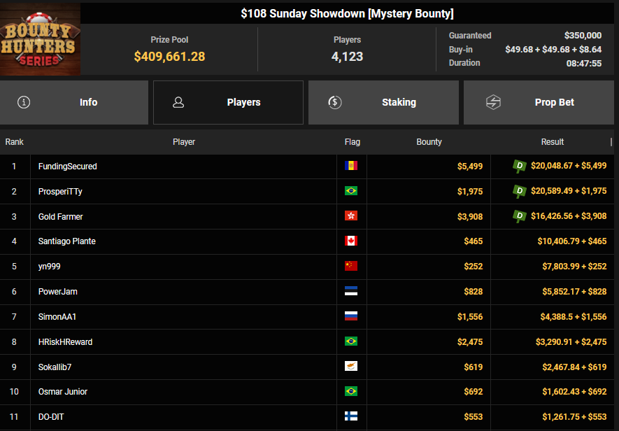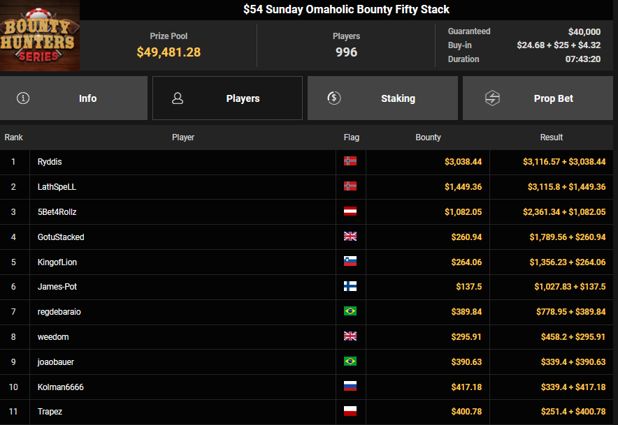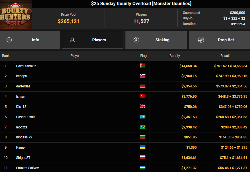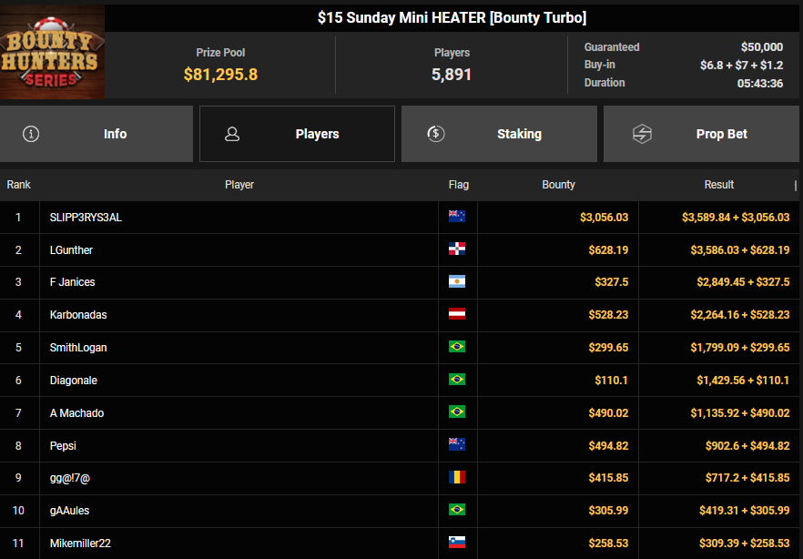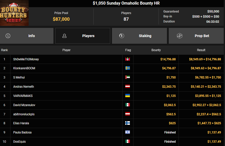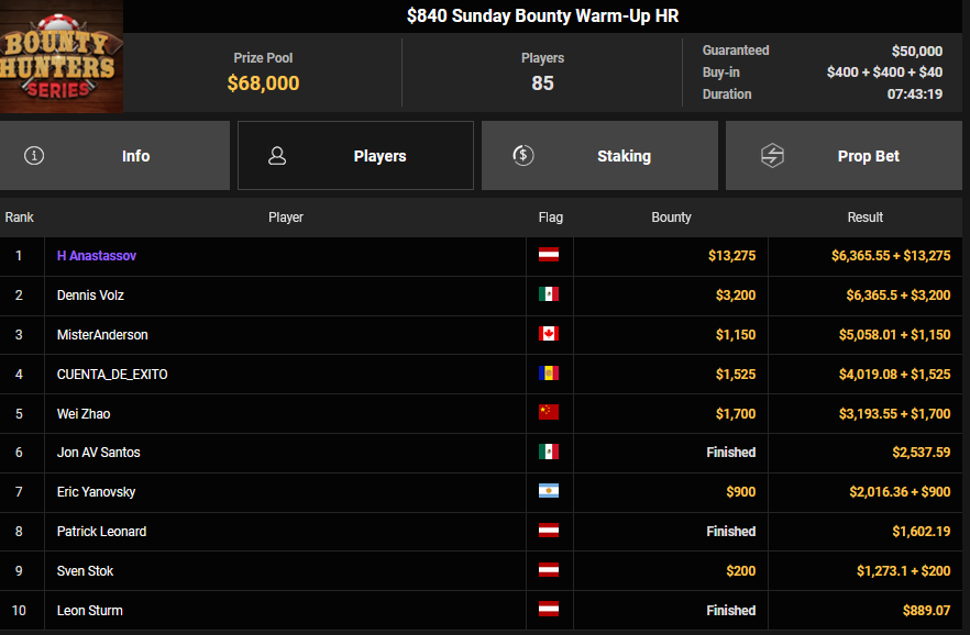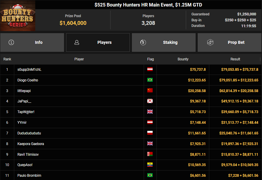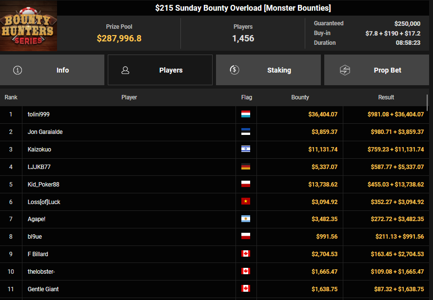 s0upp3nM1chL konnte sich beim $525 Bounty Hunters HR durchsetzen und den Sieg für $79.053 + $75.737 holen. darferdas wurde Dritter beim $25 Bounty Overload ($579 + $2.354), der Sieg beim $215 Bounty Overload ging nach Luxemburg an tolini999 für $981 + $36.404. 5Bet4Rollz belegte beim $54 Sunday Omahloic Fifty Stack Rang 3 für $2.361 + $1.082.