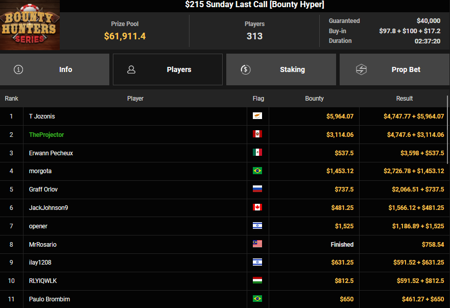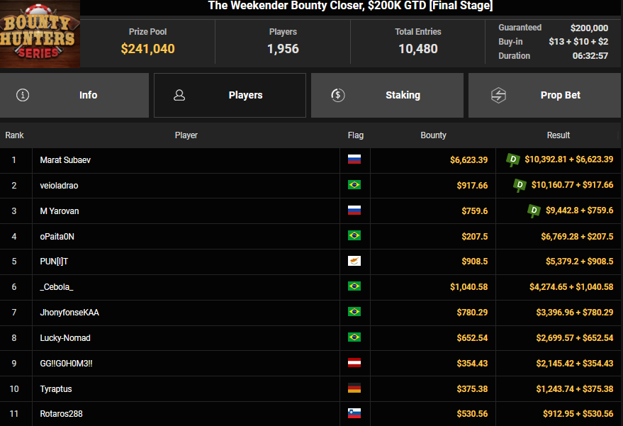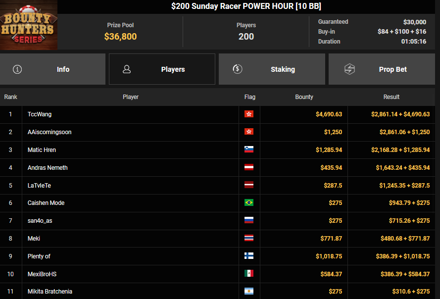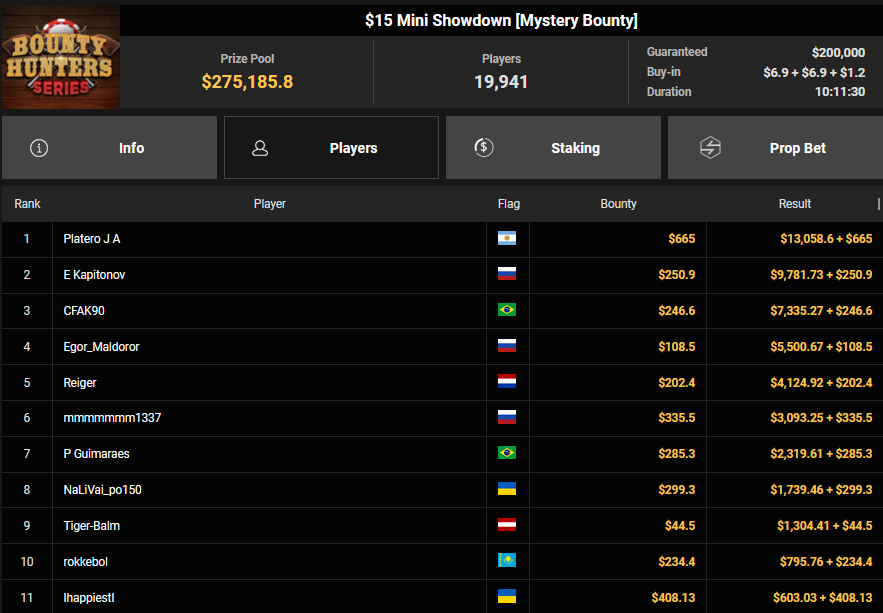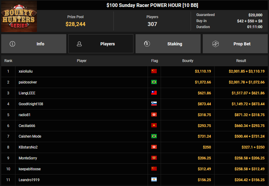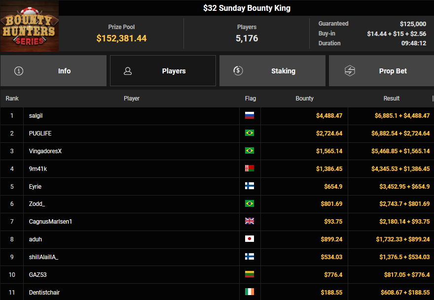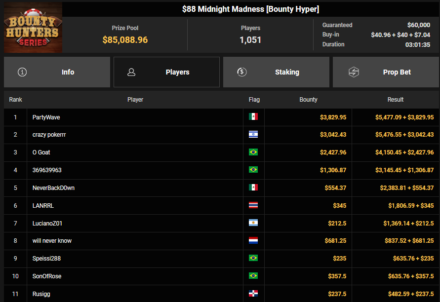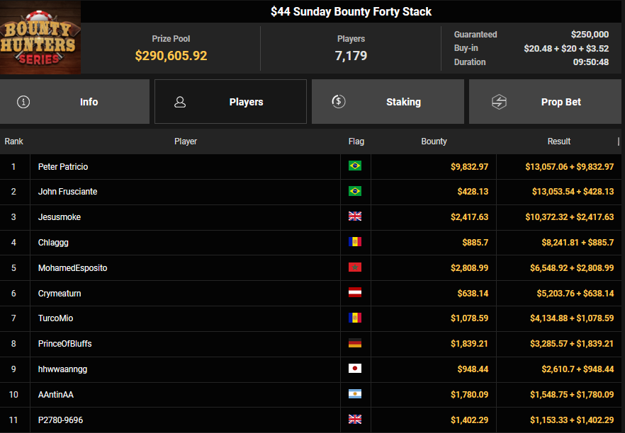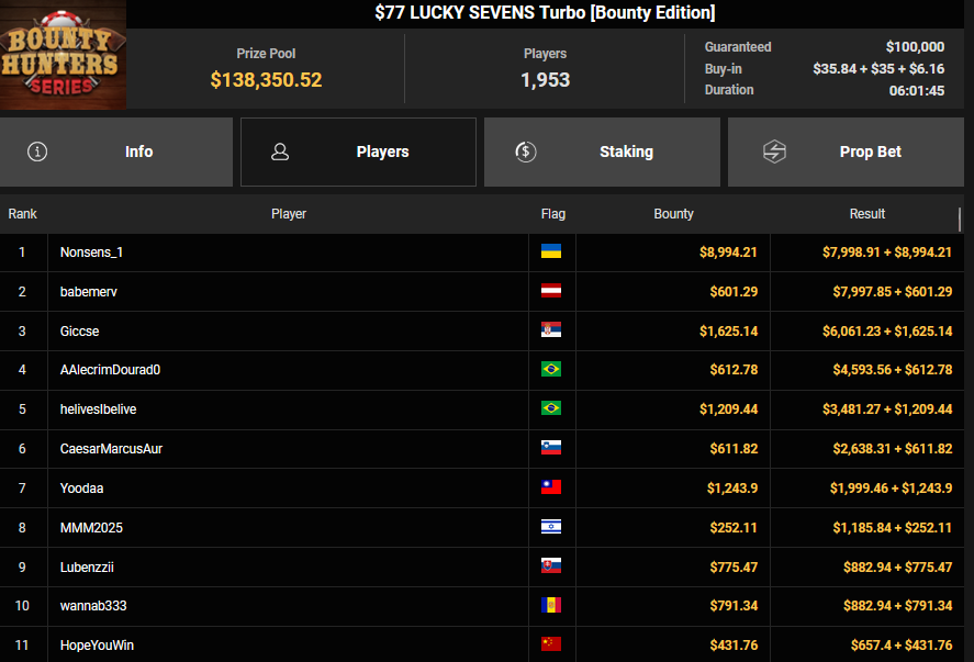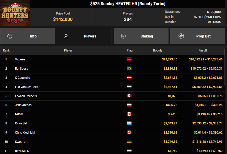 s0upp3nM1chL konnte sich beim $525 Bounty Hunters HR durchsetzen und den Sieg für $79.053 + $75.737 holen. darferdas wurde Dritter beim $25 Bounty Overload ($579 + $2.354), der Sieg beim $215 Bounty Overload ging nach Luxemburg an tolini999 für $981 + $36.404. 5Bet4Rollz belegte beim $54 Sunday Omahloic Fifty Stack Rang 3 für $2.361 + $1.082.