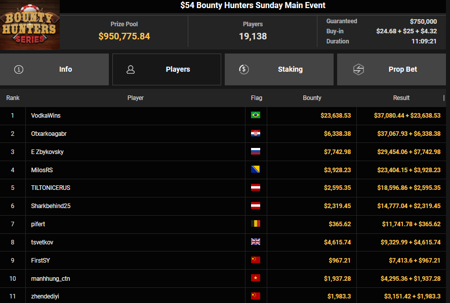 Das $54 Bounty Hunters Sunday Main Event hatte gleich 19.138 Entries und damit $950.775 Preispool. TILTONICERUS kam auf Rang 5 für $18.596 + $2.595, Sharkbehind25 wurde Sechster für $14.777 + $2.319. Der Sieg ging an den Brasilianer VodkaWins für $37.080 + $23.638.