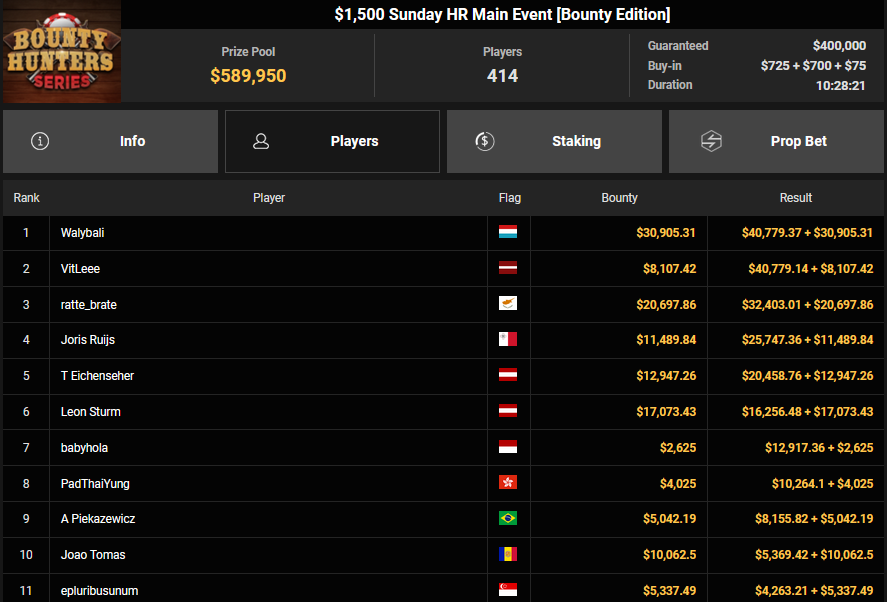 Auch Walybali konnte sich den Sieg beim $1.500 Main Event holen ($40.779 + $30.905), ZaZaGroup wurde Dritter beim $108 Sunday Showdown ($18.978 + $4.176) und babemerv wurde Runner-up beim $77 Lucky Sevens ($7.997 + $601).