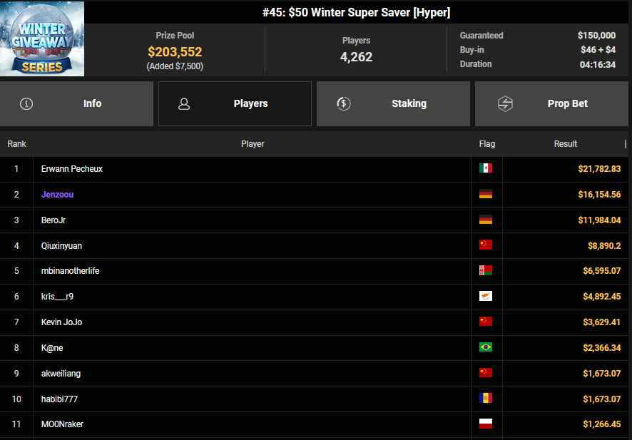 Neben dem Finale gab es noch das $50 Winter Super Saver. Auch hier wurde mit 4.262 Entries die Preisgeldgarantie deutlich übertroffen und $203.552 waren im Pot. . Der Sieg ging an Erwann Pecheux, aber Platz 2 für $16.154 ging an den deutschen Twitch-Streamer Jenzoou. Platz 3 sicherte sich BeroJr für $11.984.