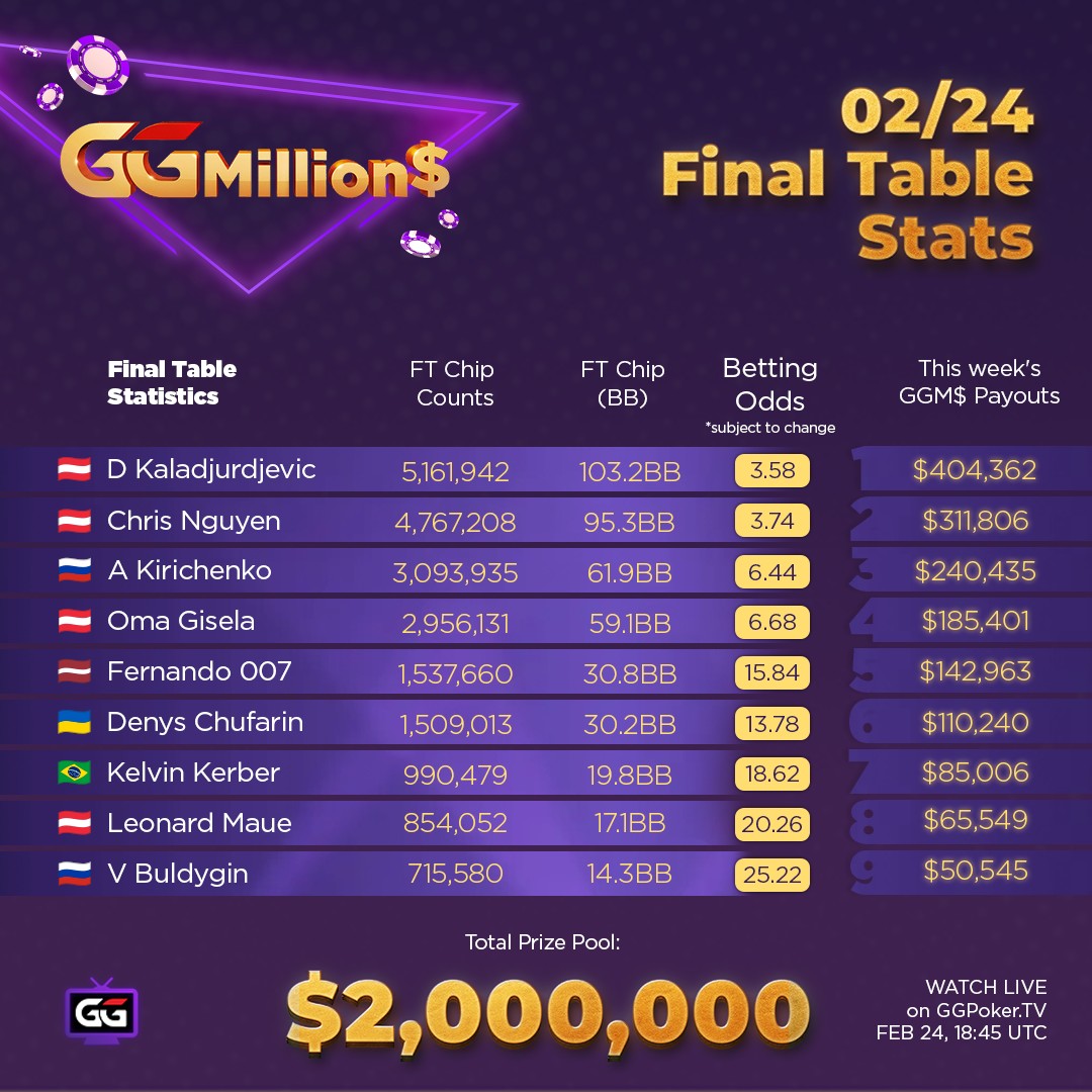 Drei von neun – Chris Nguyen, Oma Gisela und Leonard Maue nehmen heute am Final Table beim $10.000 GGMillion$ auf GGPoker Platz. Jef Gross kommentiert mit Pedro Neves ab 19:15 Uhr. Viel Spaß!
