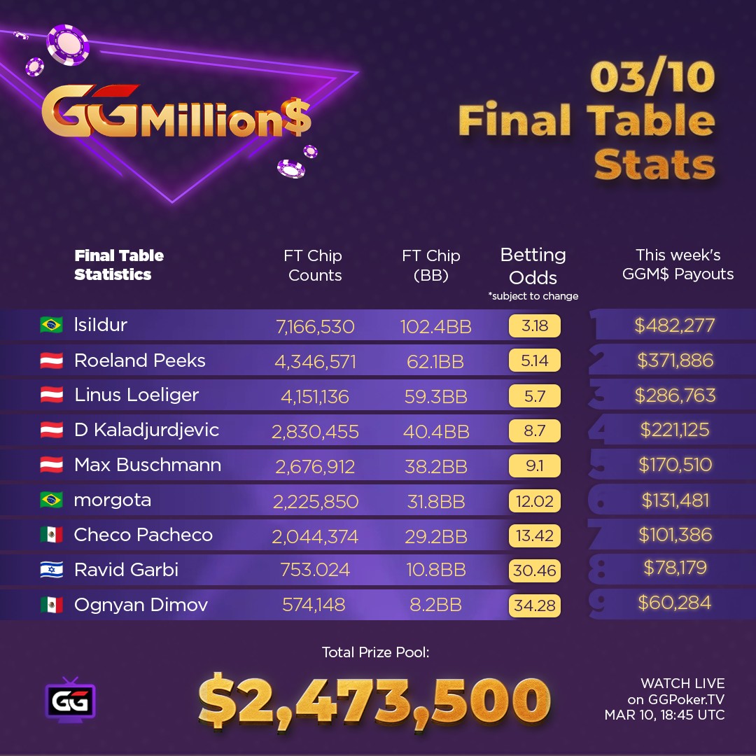Diese Woche sind Linus Löliger ud Max Buschmann am Final Table des $10.000 GGMillion$ auf GGPoker. $482.277 warten dieses Mal auf den Sieger. Jeff Gross kommentiert heute mit Mathias Joelsson ab 19:15 Uhr. Viel Spaß!