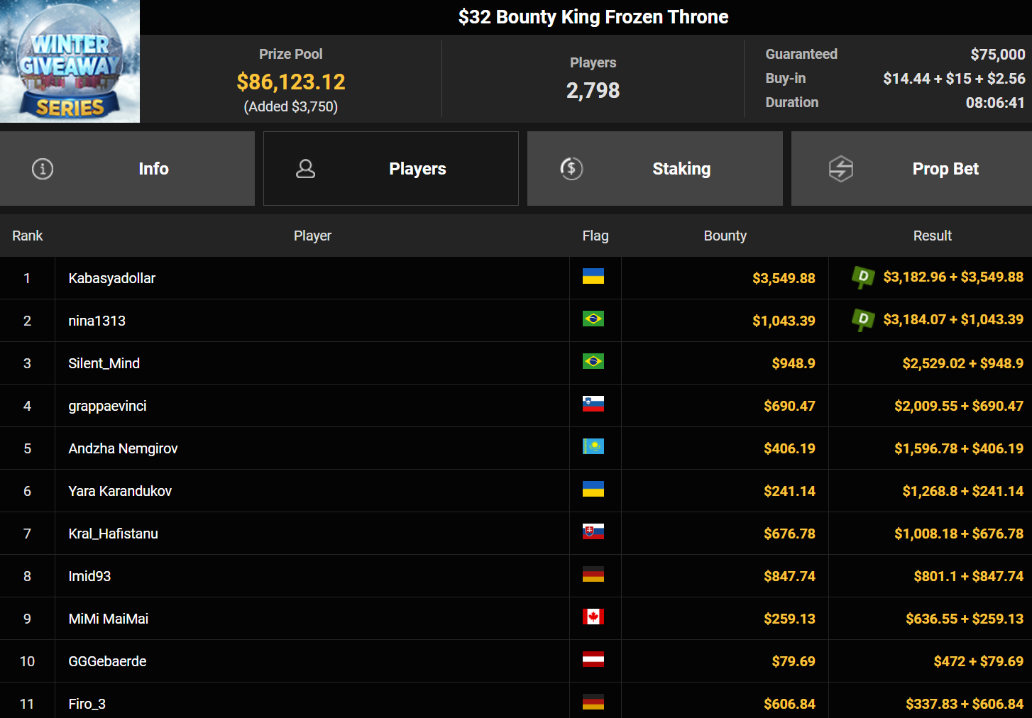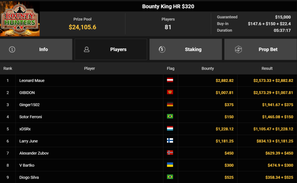Leonard Maue konnte sich beim $320 Bounty King den Sieg für $2.573+ $2.882 sichern, Ginger1502 belegte Rang 3 für $1.941 + $375.