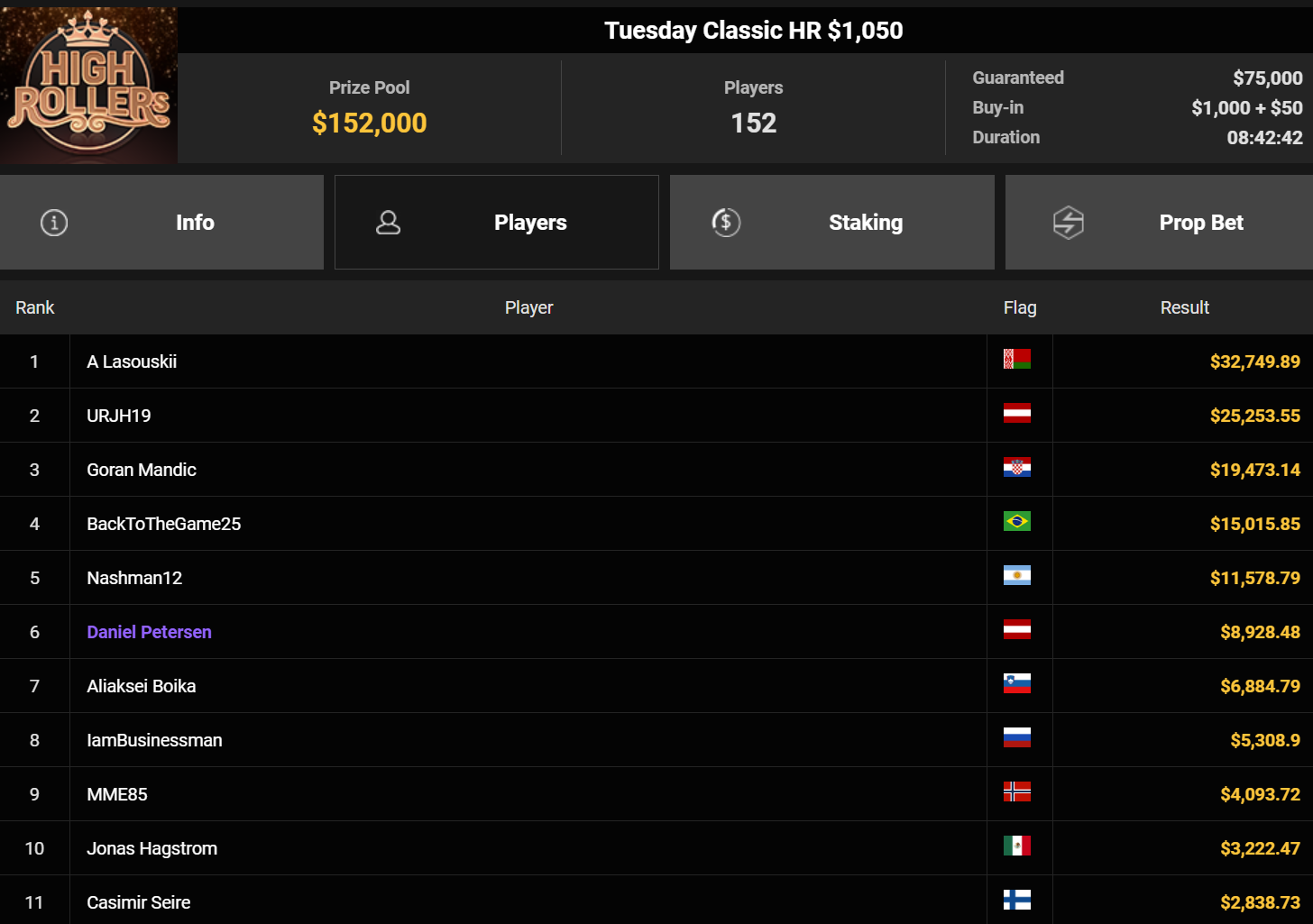 URJH19 wurde beim $1.050 Tuesday Classics HR Runner-up für $25.253. whosdatgirl belegte beim $54 Bounty Fifty Stack Rang 3 für $3.736 + $1.723.