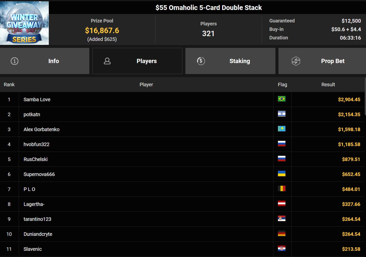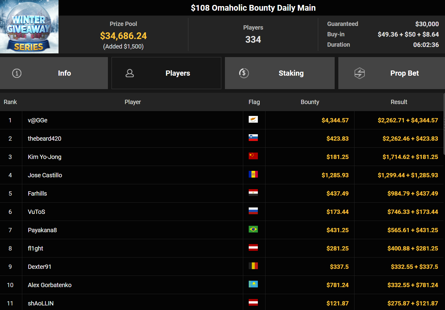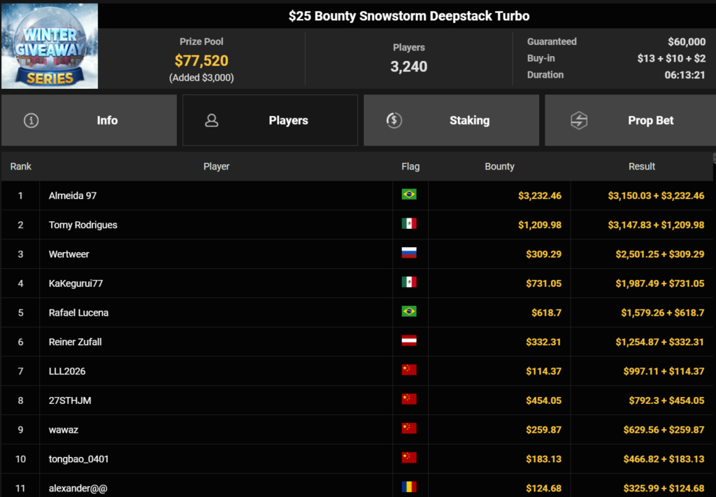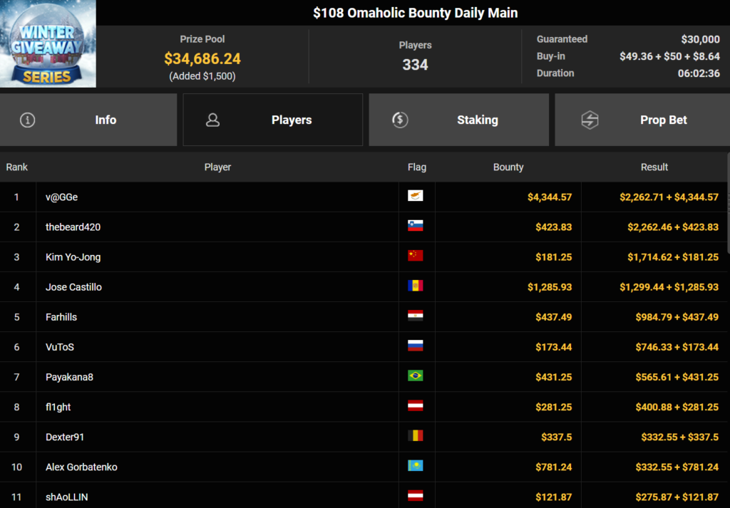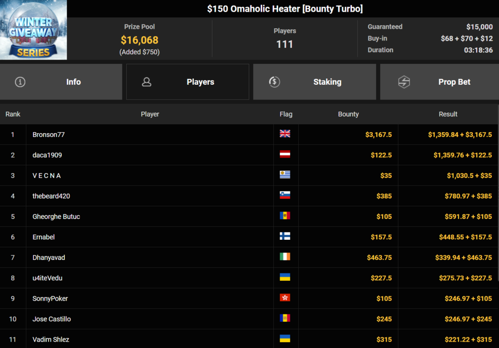 Mahdi28277 wurde Dritter beim $54 Bounty Snowball ($3.739 + $1.949, daca1909 verpasste den Sieg beim $150 Omaholic Heater ($1.359 + $122.