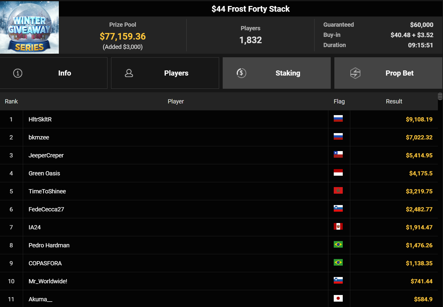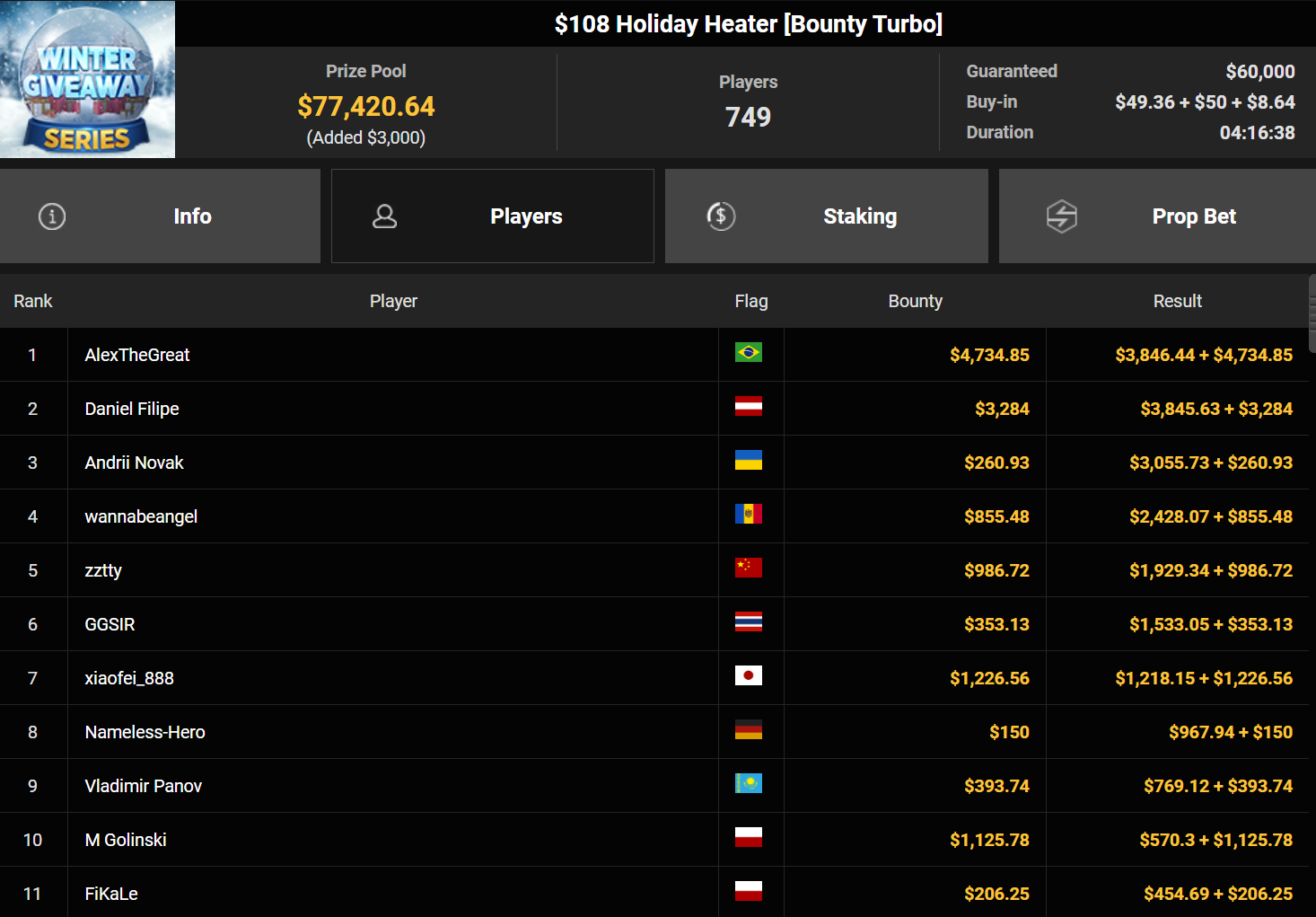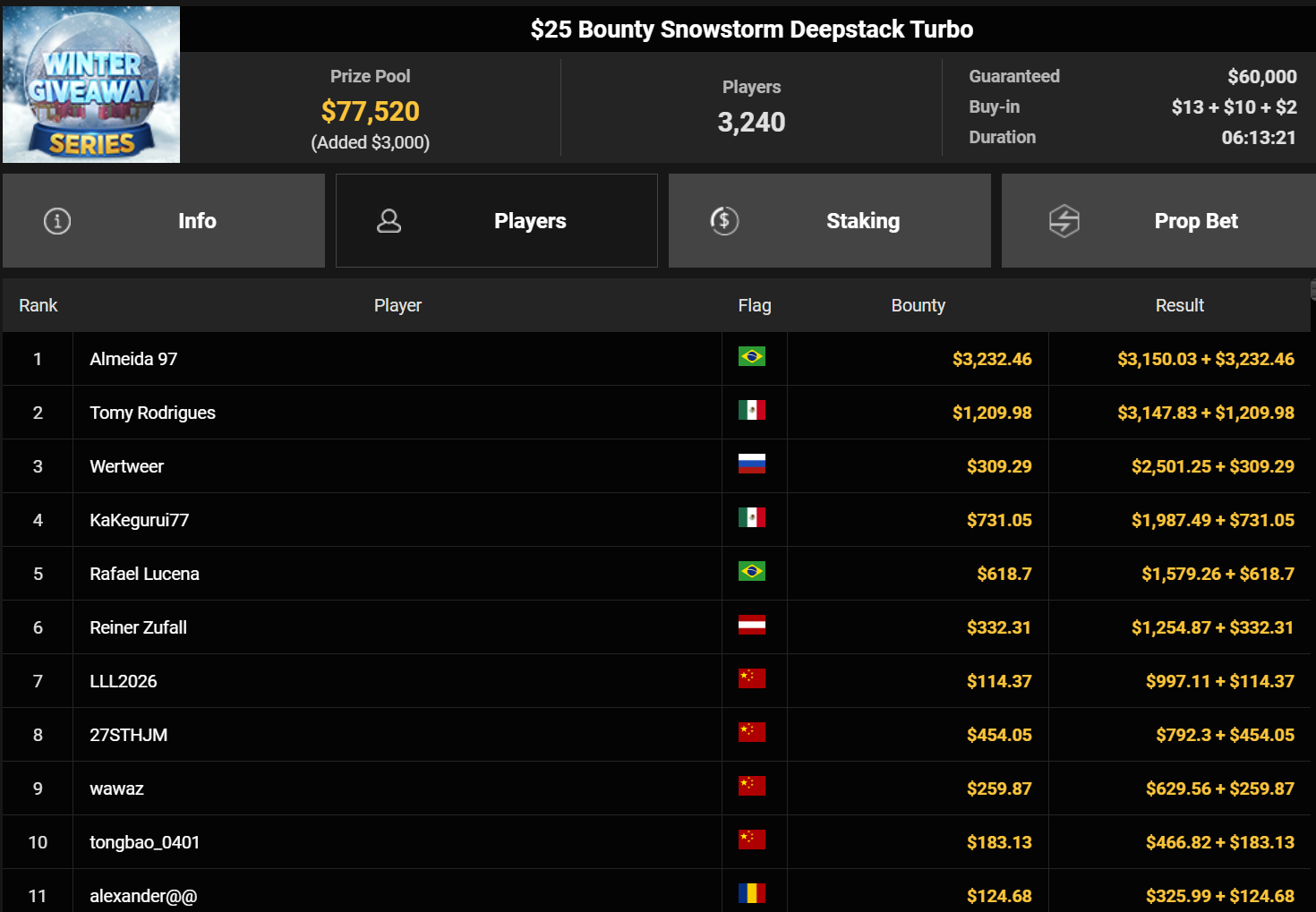 Mahdi28277 wurde Dritter beim $54 Bounty Snowball ($3.739 + $1.949, daca1909 verpasste den Sieg beim $150 Omaholic Heater ($1.359 + $122.