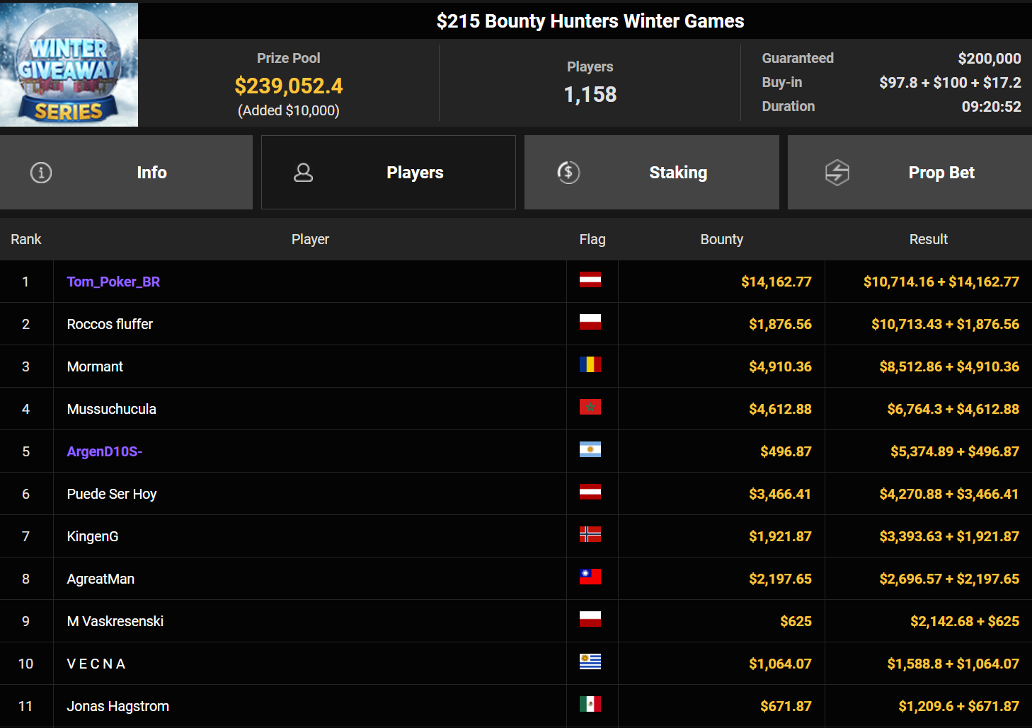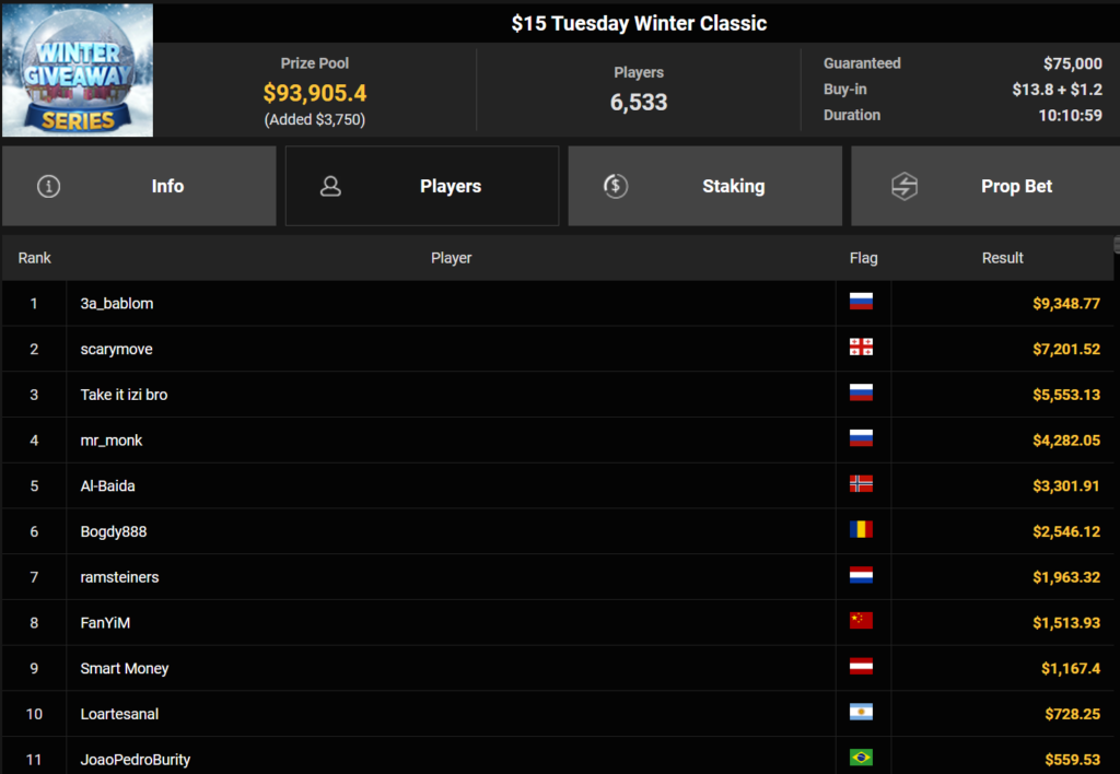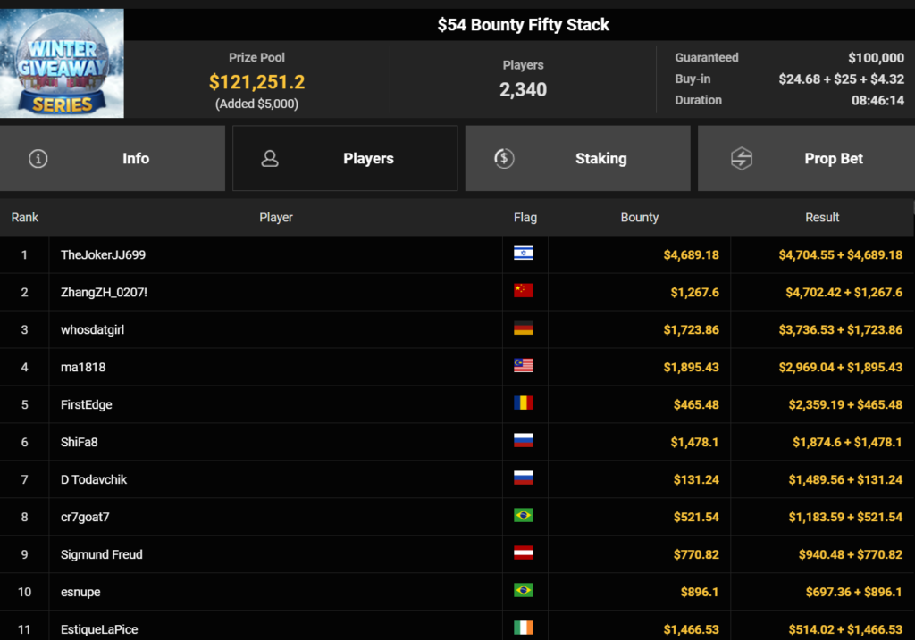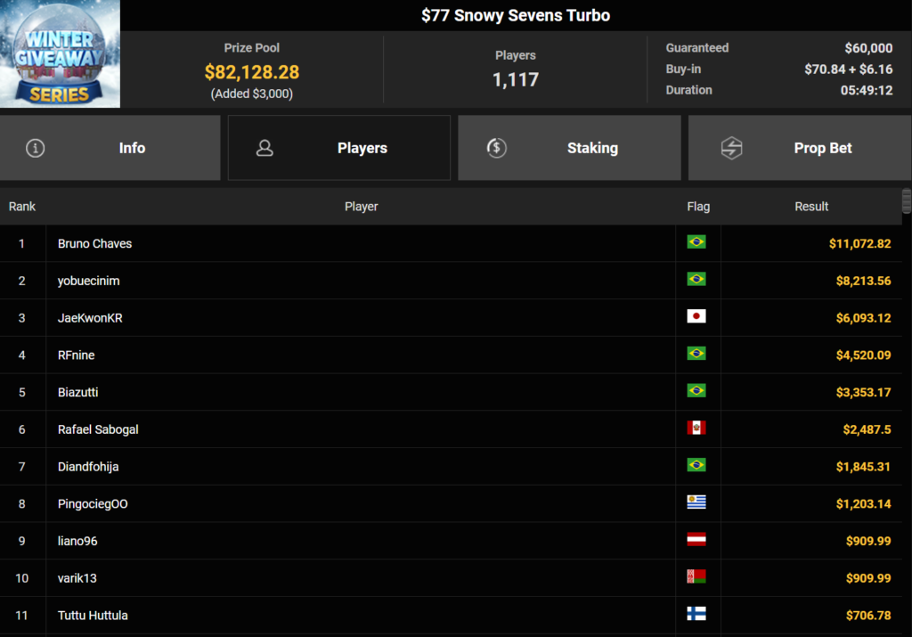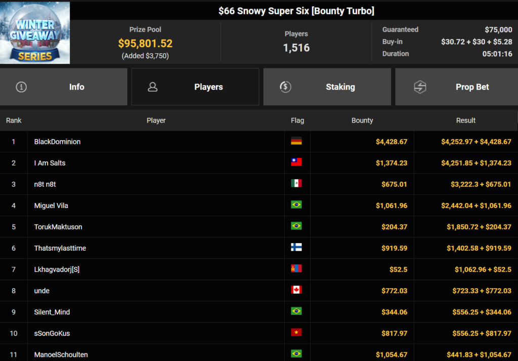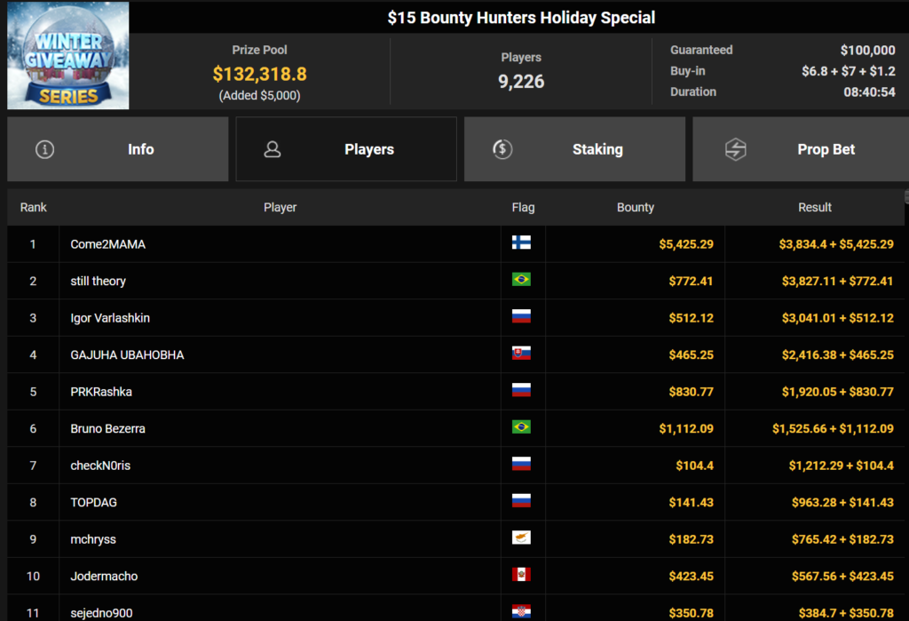 Wahl-Österreicher Tom_Poker-BR holte den Sieg beim $215 Bounty Hunters Winter Games für $10.716 + $14.162. liano96war beim $125 Winter Marathon erfolgreich ($32.478), Oma Gisela belegte Rang 3 für $19.310.