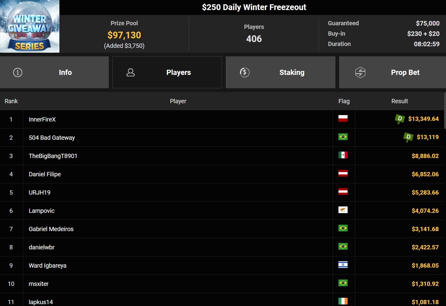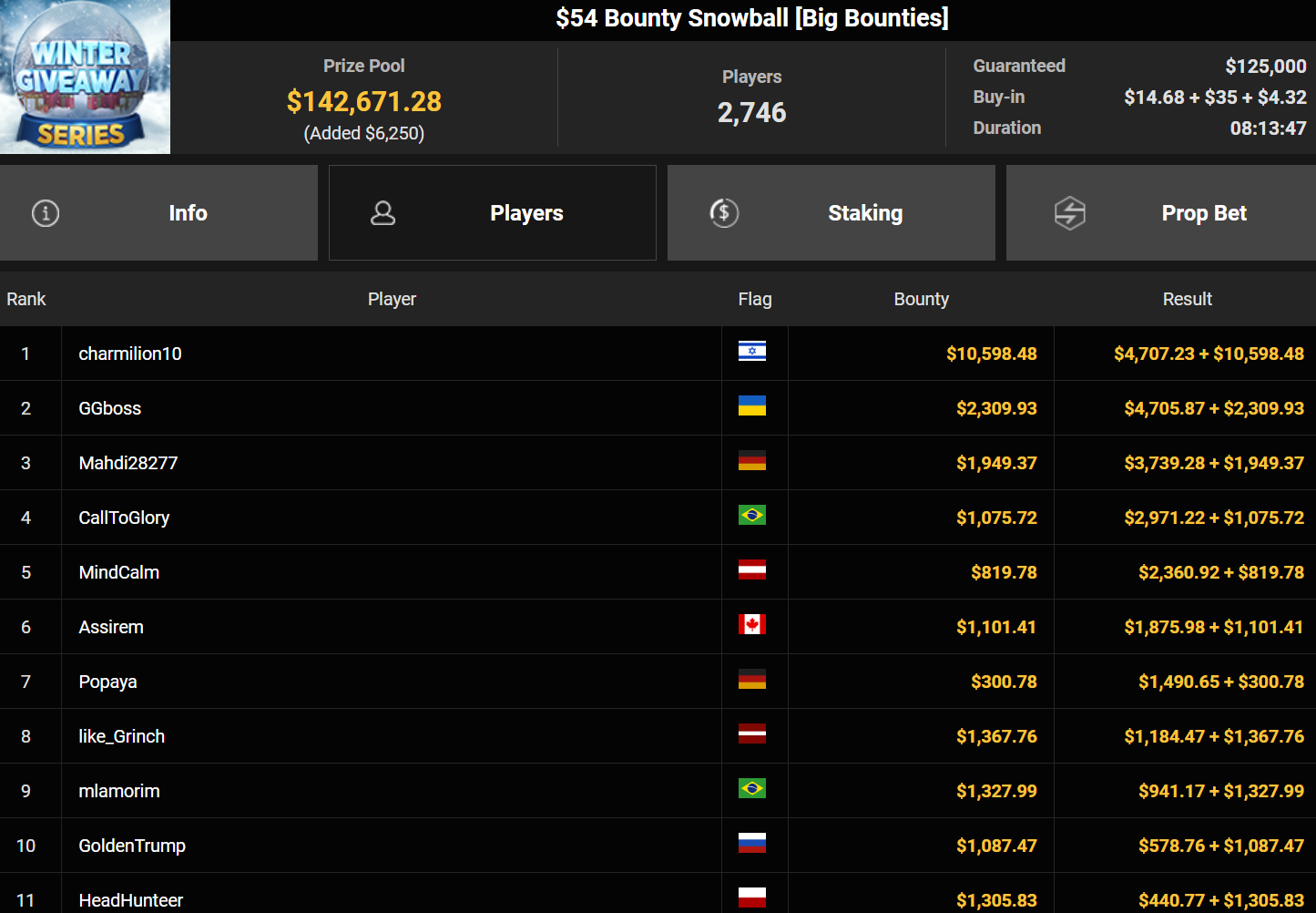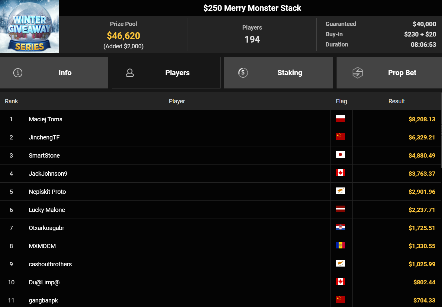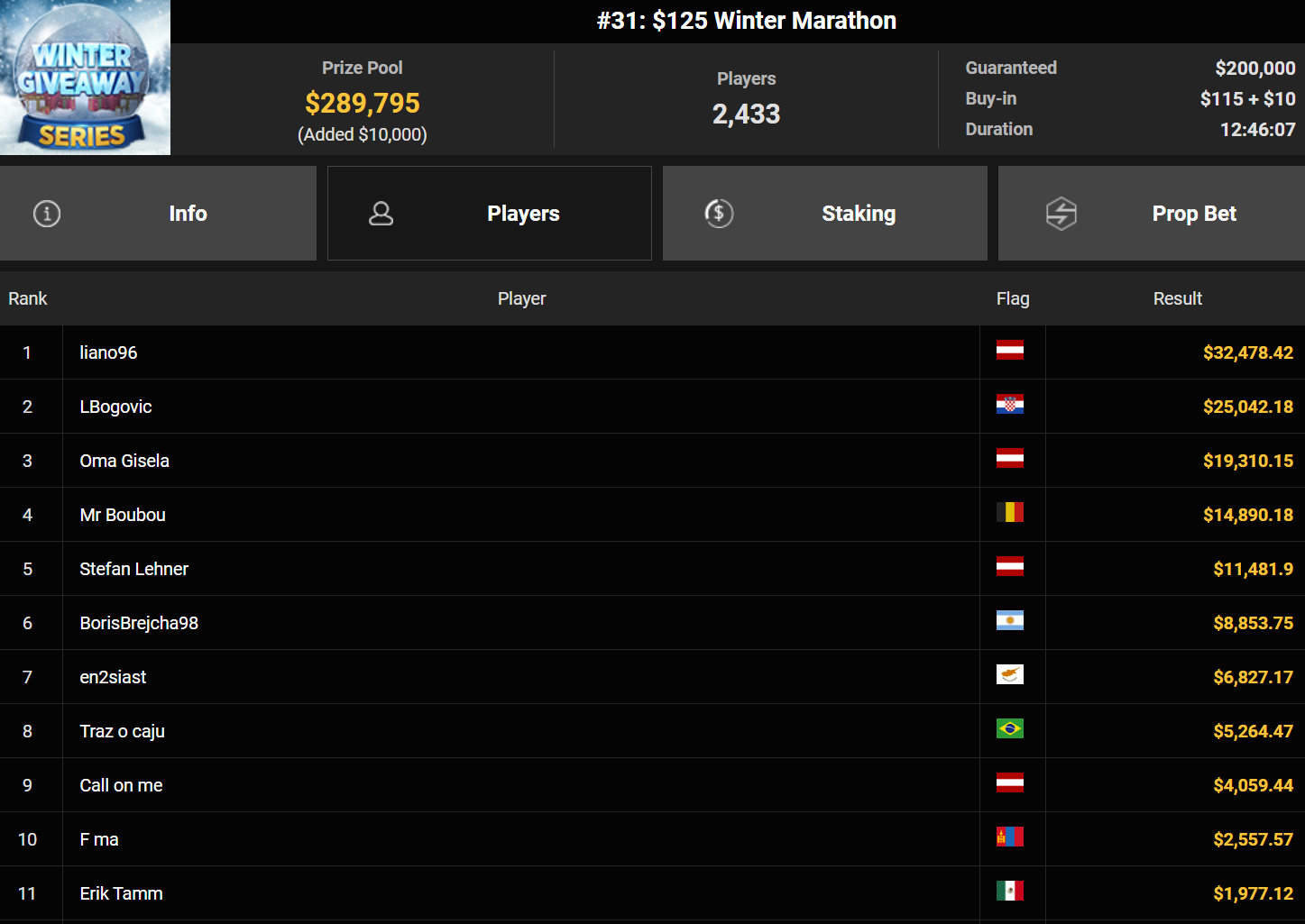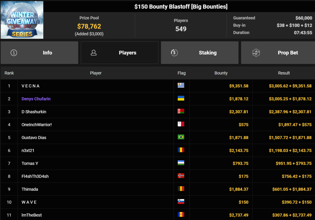 Wahl-Österreicher Tom_Poker-BR holte den Sieg beim $215 Bounty Hunters Winter Games für $10.716 + $14.162. liano96war beim $125 Winter Marathon erfolgreich ($32.478), Oma Gisela belegte Rang 3 für $19.310.