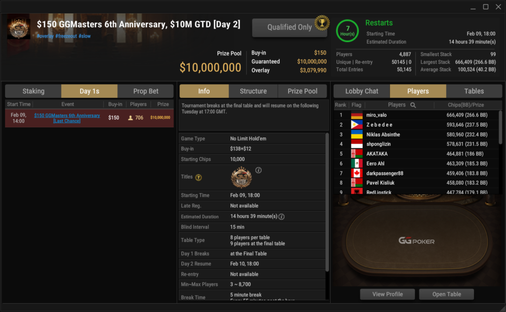 Nur noch der Last Chance Heat steht beim $150 GGMasters 6th Anniversary auf GGPoker an, noch fehlen aber mehr als $3.000.000 auf die $10.000.000 Garantie. Der Deutsche miro_valo ist der Chipleader.