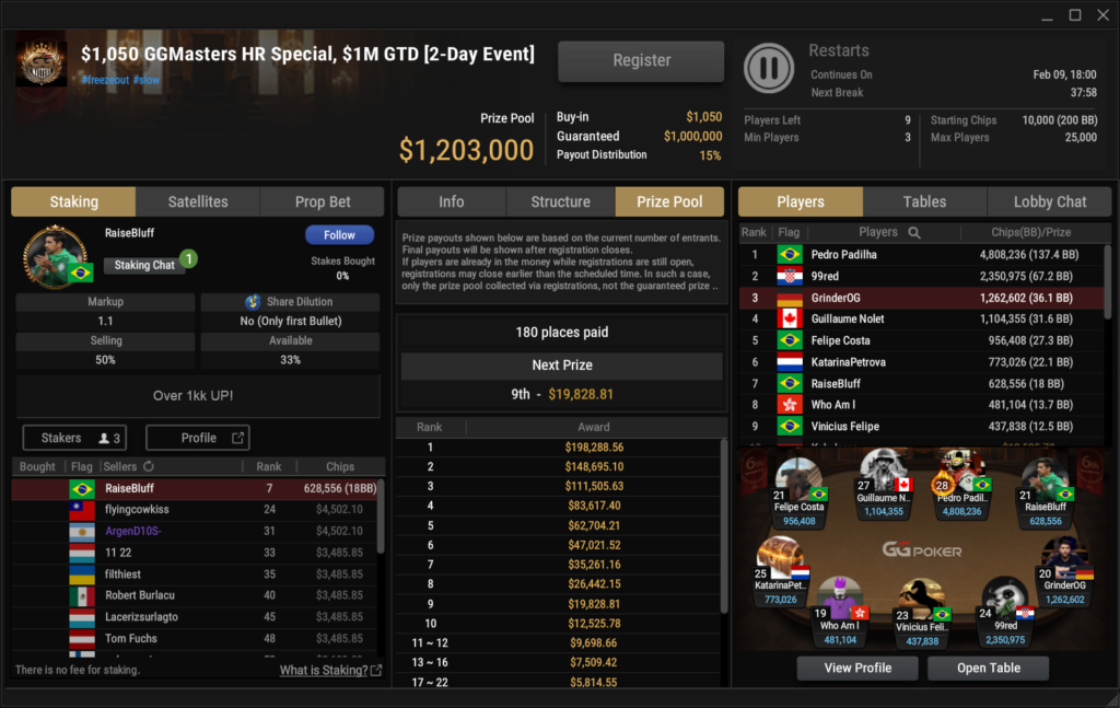 Gut aufgestellt ist auch GrinderOG, der beim $1.050 GGMasters HR auf Rang 3 liegt. Neun Spieler der 1.203 Starter gehen hier ins Finale, der Sieger kann sich auf $198.288 freuen.