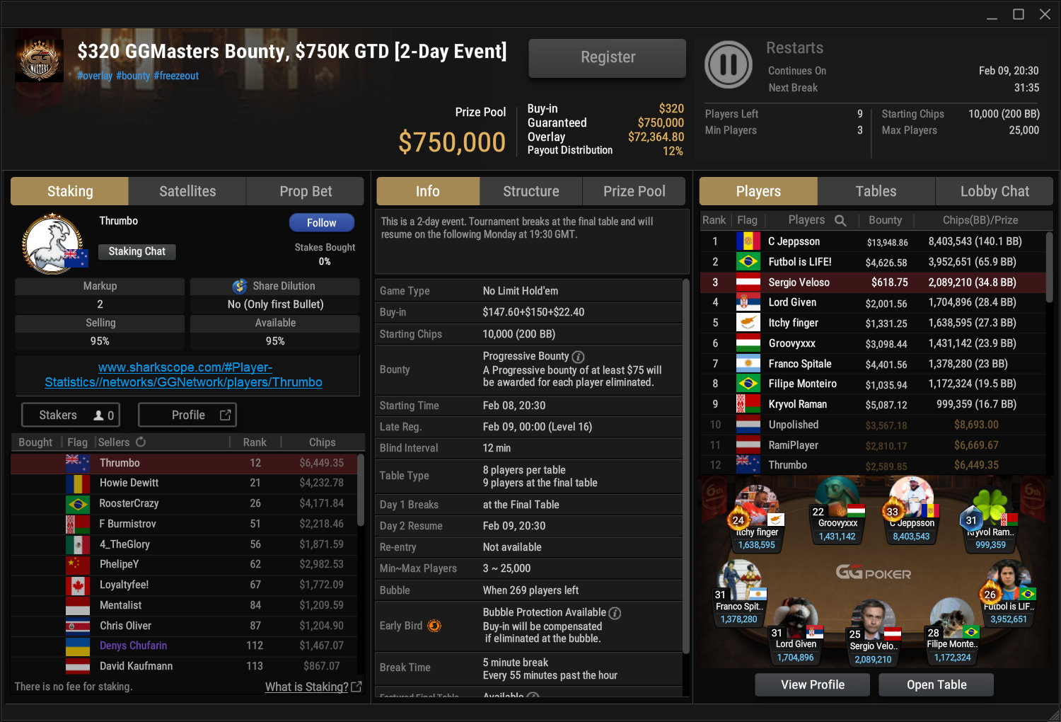 Beim $320 GGMasters Bounty schaffte man die Garantie nicht, Österreich-Fahne Sergio Veloso liegt auf Rang 3.