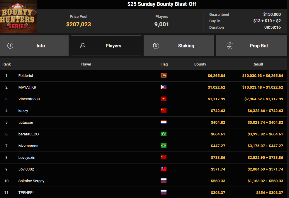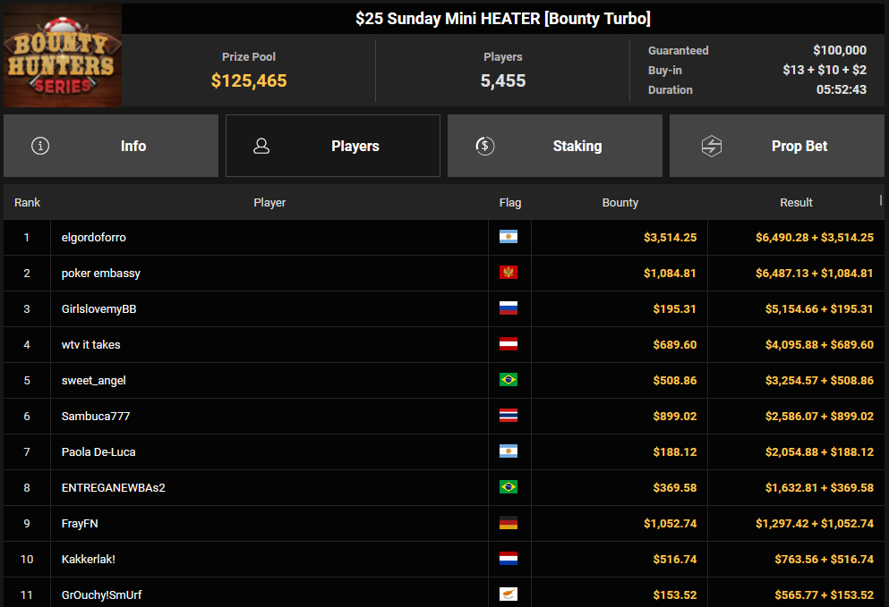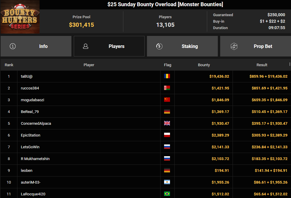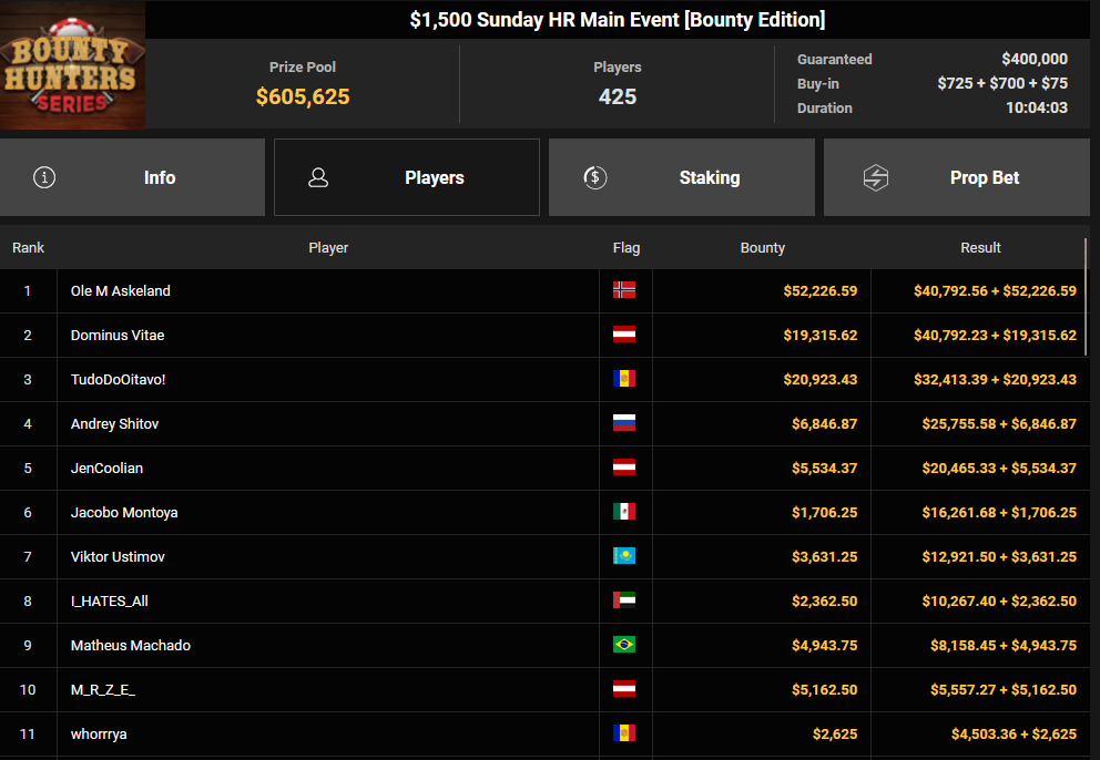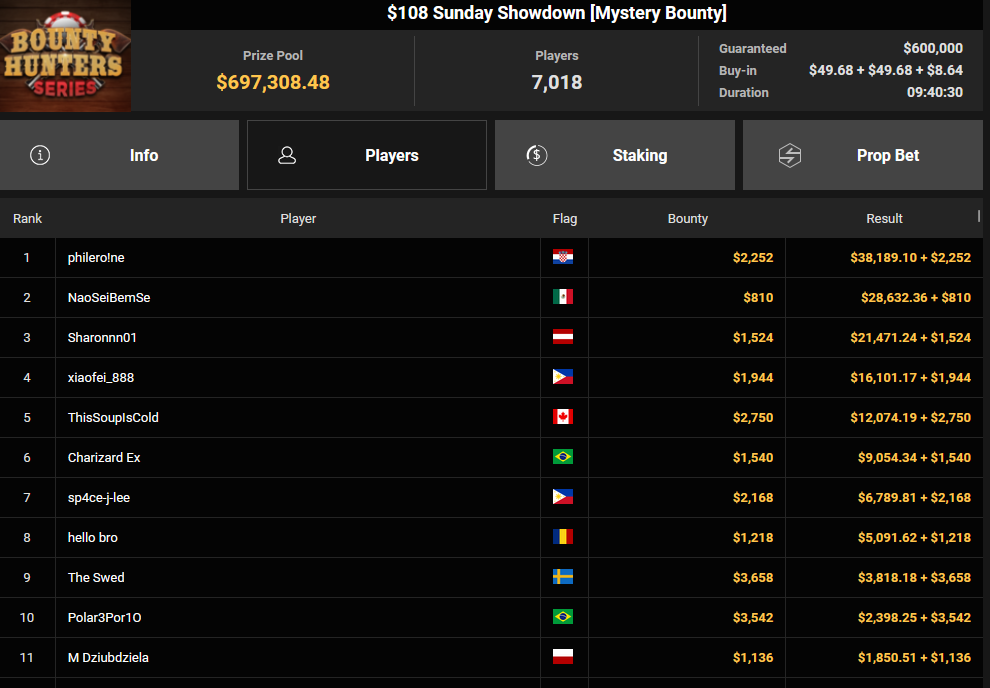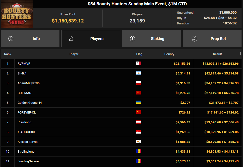 Massiv waren die Zahlen wieder beim $54 Bounty Hunters Sunday Main Event, bei dem man mit 23.159 Entries auf $1.150.539 Preispool kam. RVPMVP holte den Sieg für $43.008 + $26.153. Pferdinho wurde bester Deutscher und kassierte $13.620 + $2.566 für Rang 7.