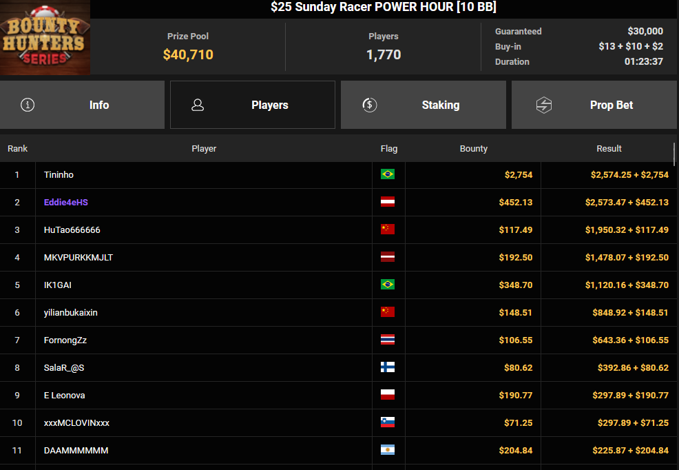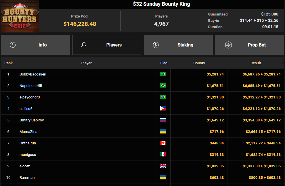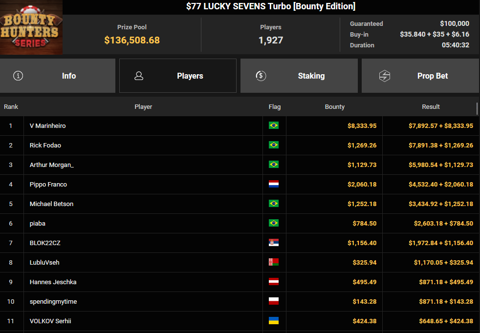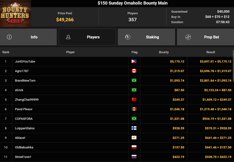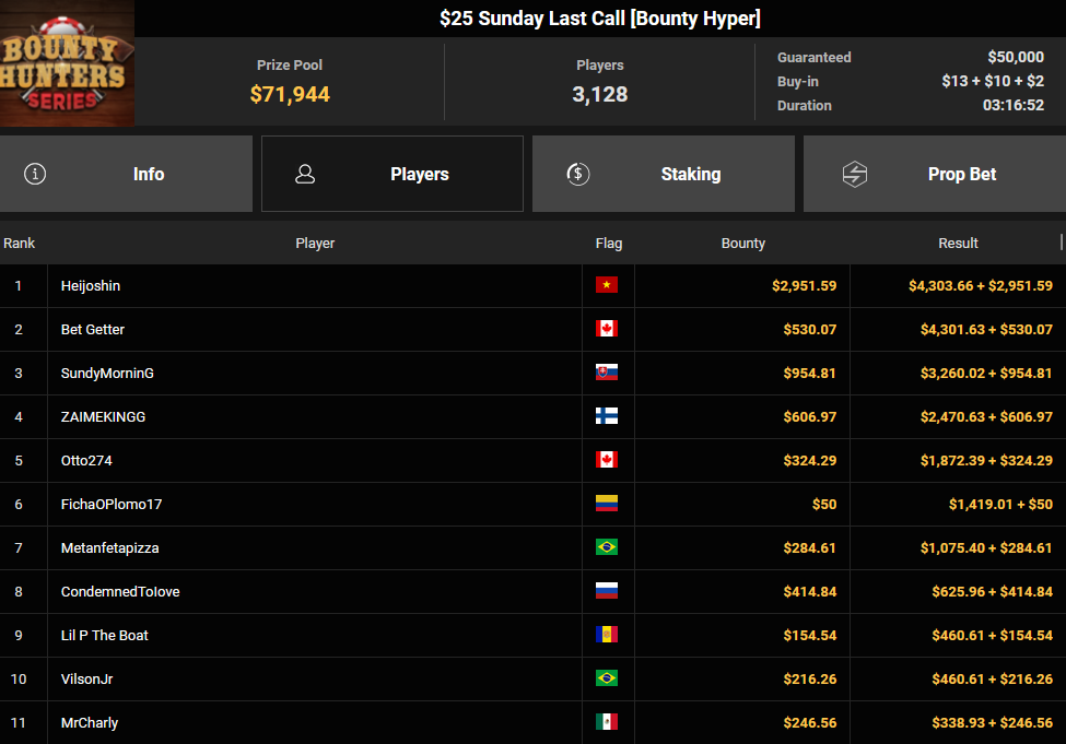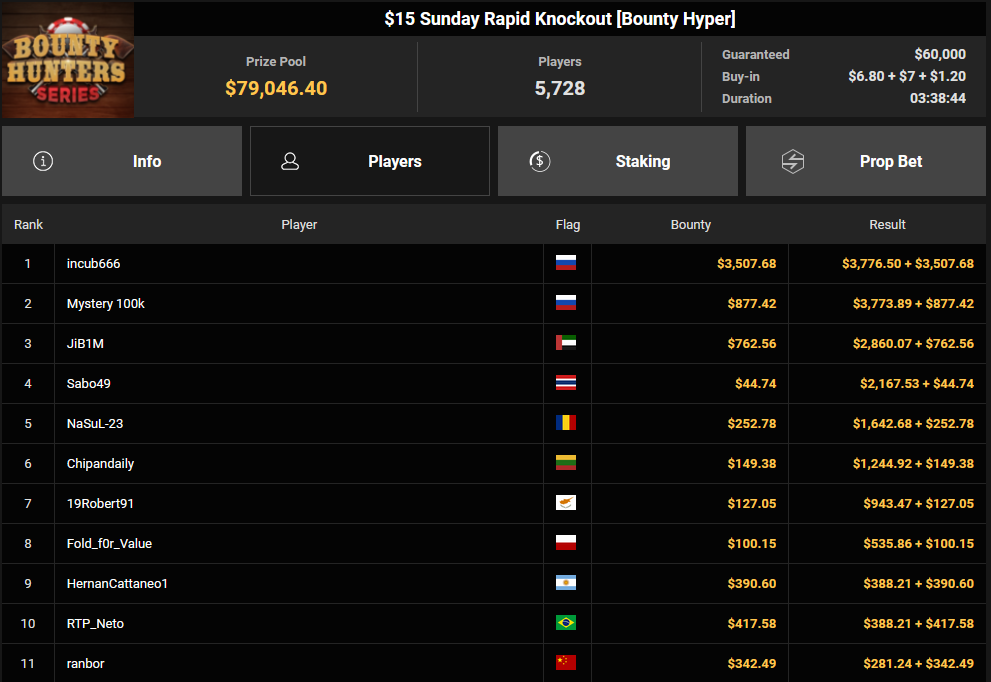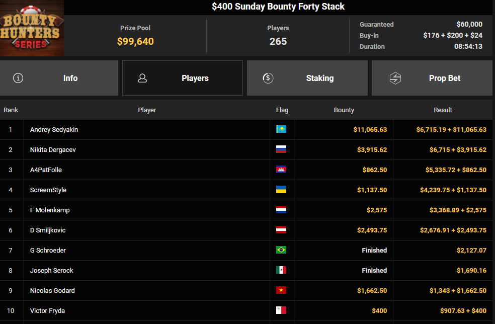 Massiv waren die Zahlen wieder beim $54 Bounty Hunters Sunday Main Event, bei dem man mit 23.159 Entries auf $1.150.539 Preispool kam. RVPMVP holte den Sieg für $43.008 + $26.153. Pferdinho wurde bester Deutscher und kassierte $13.620 + $2.566 für Rang 7.