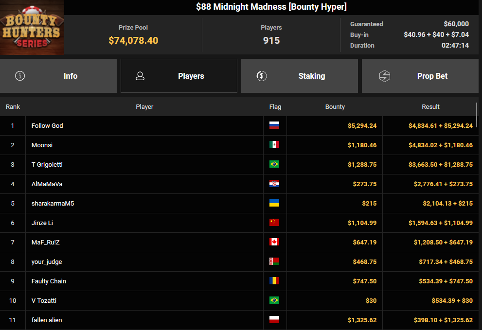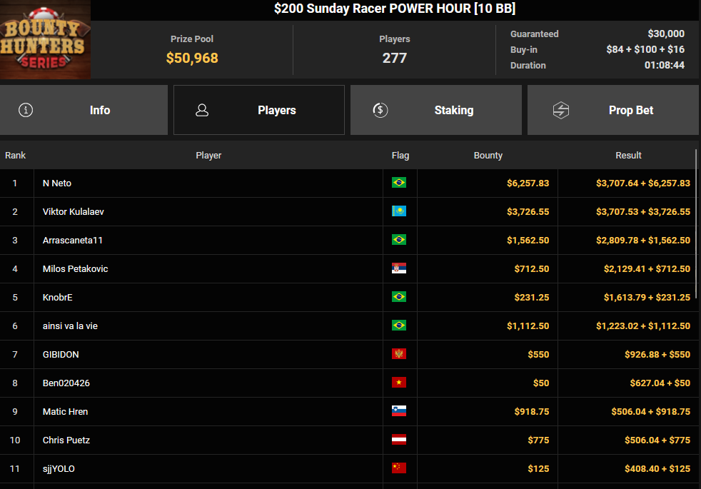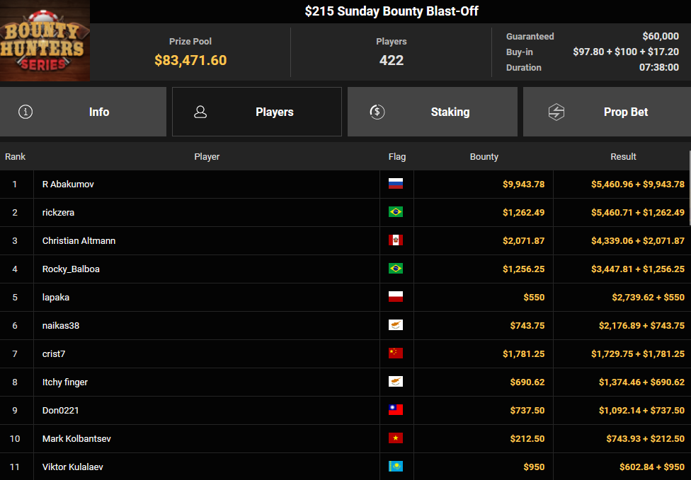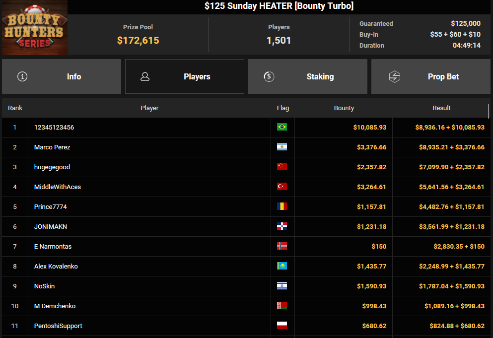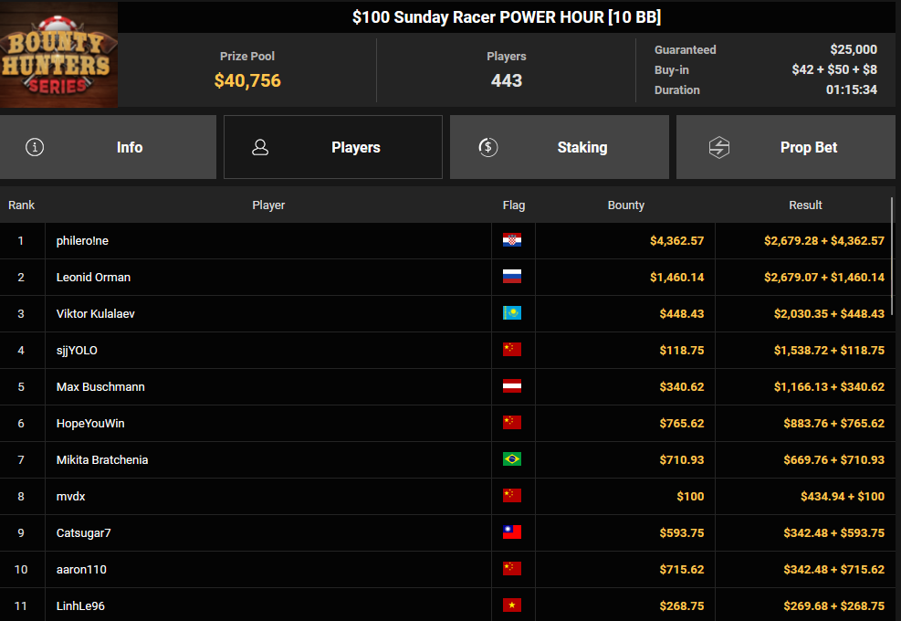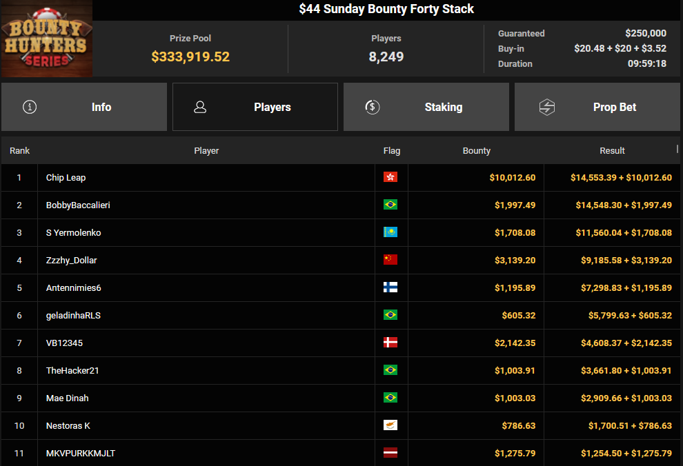 Massiv waren die Zahlen wieder beim $54 Bounty Hunters Sunday Main Event, bei dem man mit 23.159 Entries auf $1.150.539 Preispool kam. RVPMVP holte den Sieg für $43.008 + $26.153. Pferdinho wurde bester Deutscher und kassierte $13.620 + $2.566 für Rang 7.