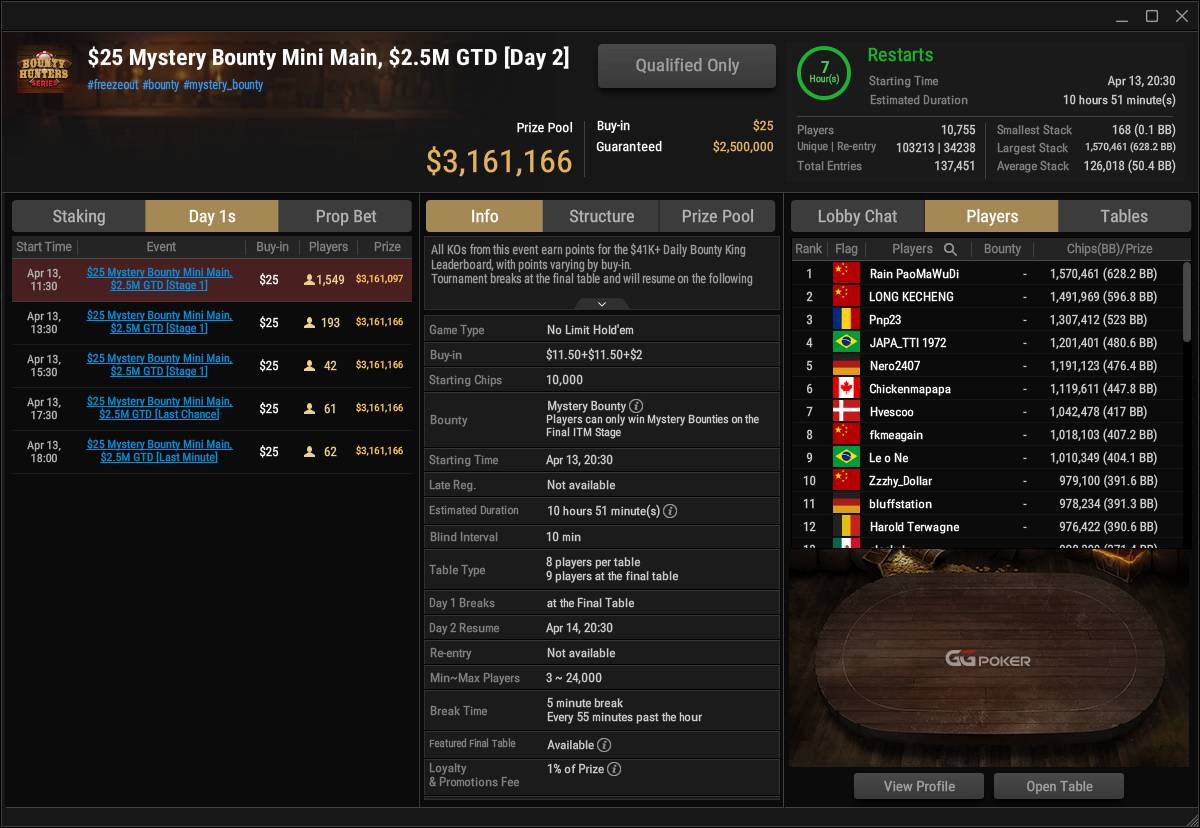 Schon mehr als $3.100.000 Preisgeld sind es beim $25 Mystery Bounty Mini Main Event. Bis 18 Uhr laufen noch Flights, Tag 2 startet dann um 20:30 Uhr.
