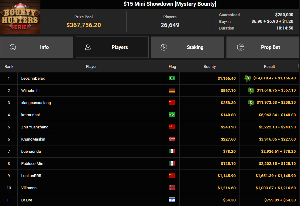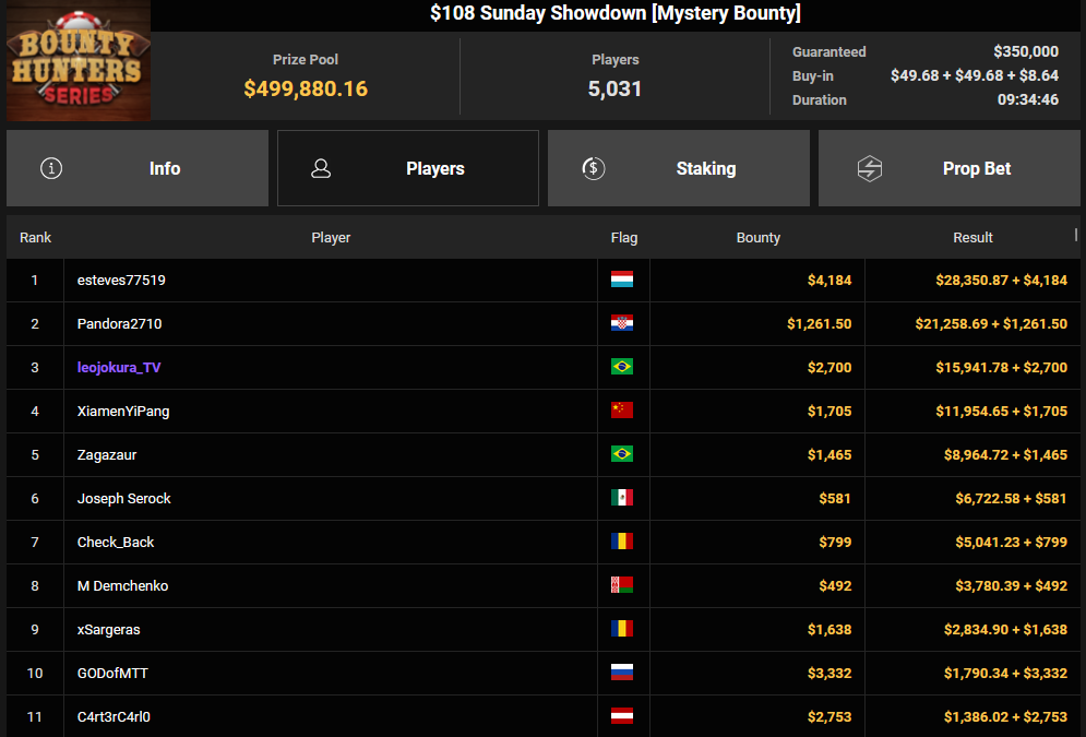 Während es bei den High Roller und anderen Turnieren sehr gut für die DACHs lief, war der Sonntag bei der Bounty Hunters Series eher durchwachsen. Wilhelm III kassierte $11.618 +$567 beim $15 Mini Showdown Mystery Bounty. Der Luxemburger esteves77519 2 setzte sich bei der $108 Sunday Showdown Ausgabe durch und wurde mit $28.350 + $4.184 belohnt.