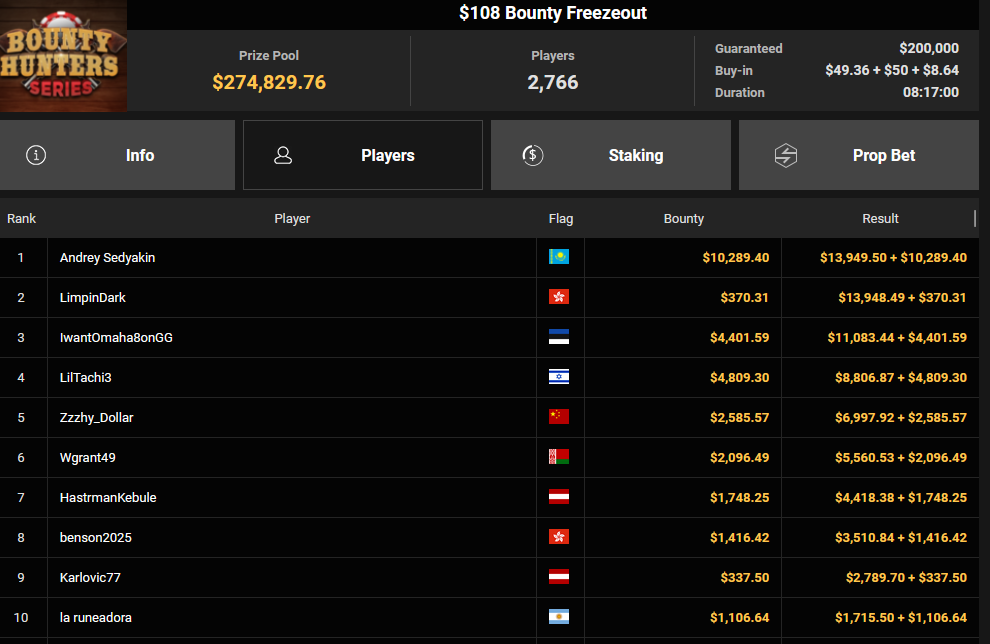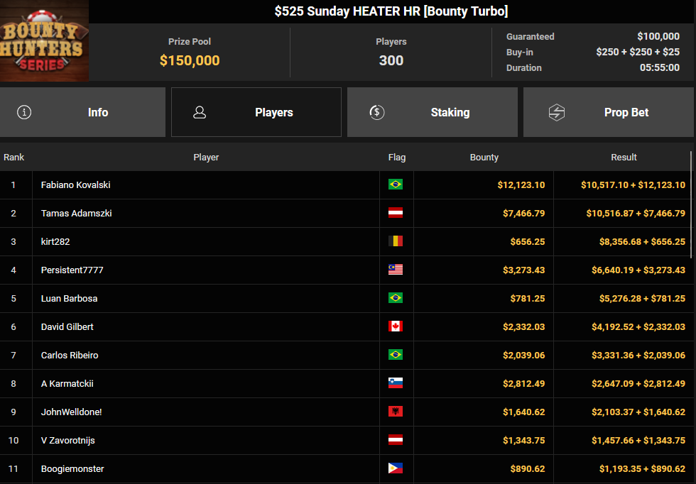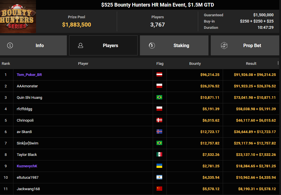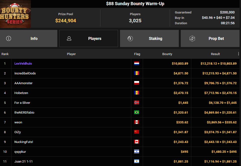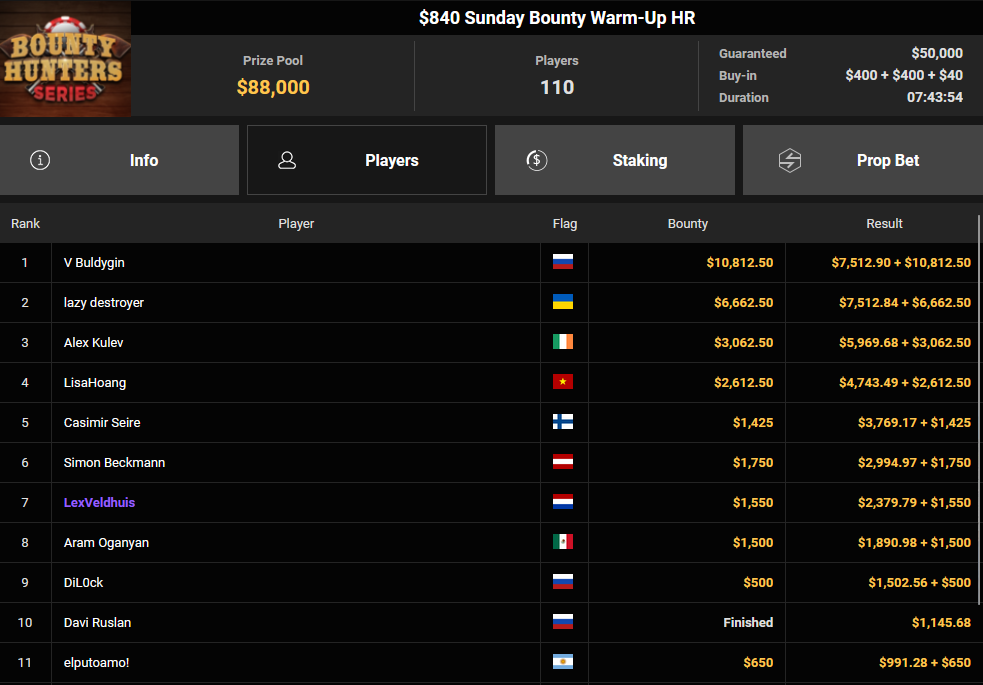 Lex Veldhuis war beim $88 Bounty Warm-up für $12.218 + $10.803 erfolgreich. Sein niederländischer Streamer-Kollege in Österreich, Tom „Tom_Poker_BR“ Talboom konnte sich beim $525 Bounty Hunters HR Main Event bei 3.767 Entries behaupten, was ihm satte $91.926 + $96.214 bescherte.