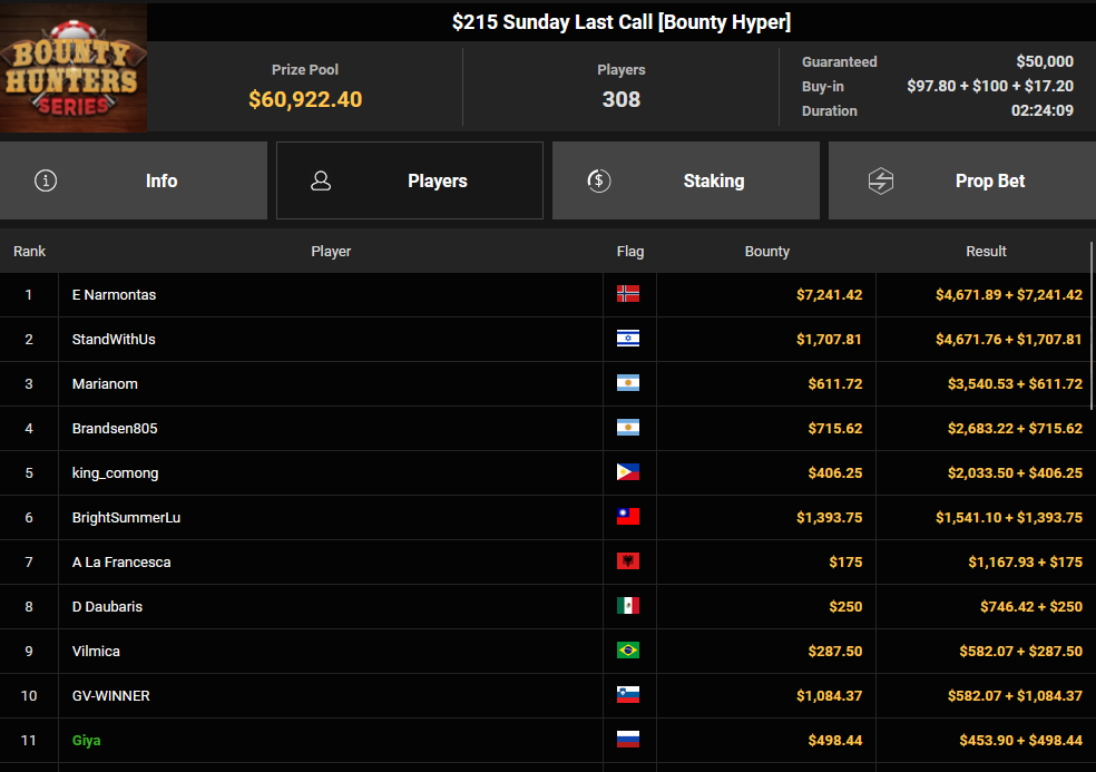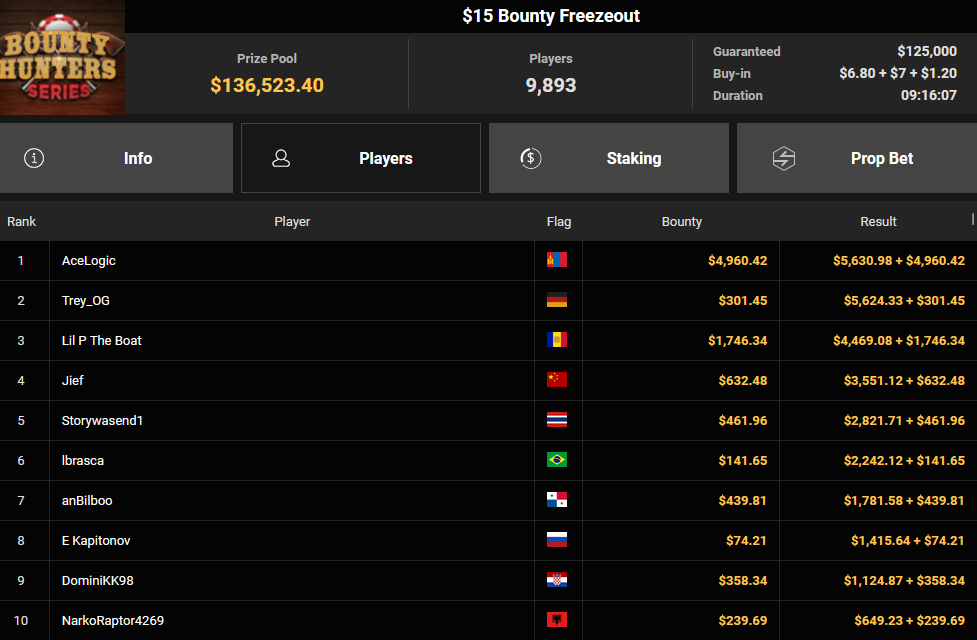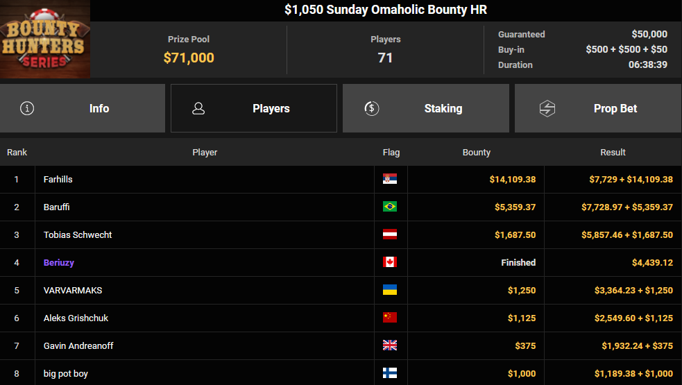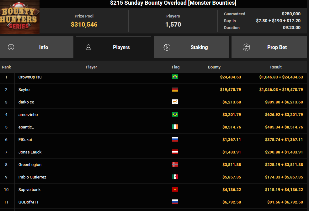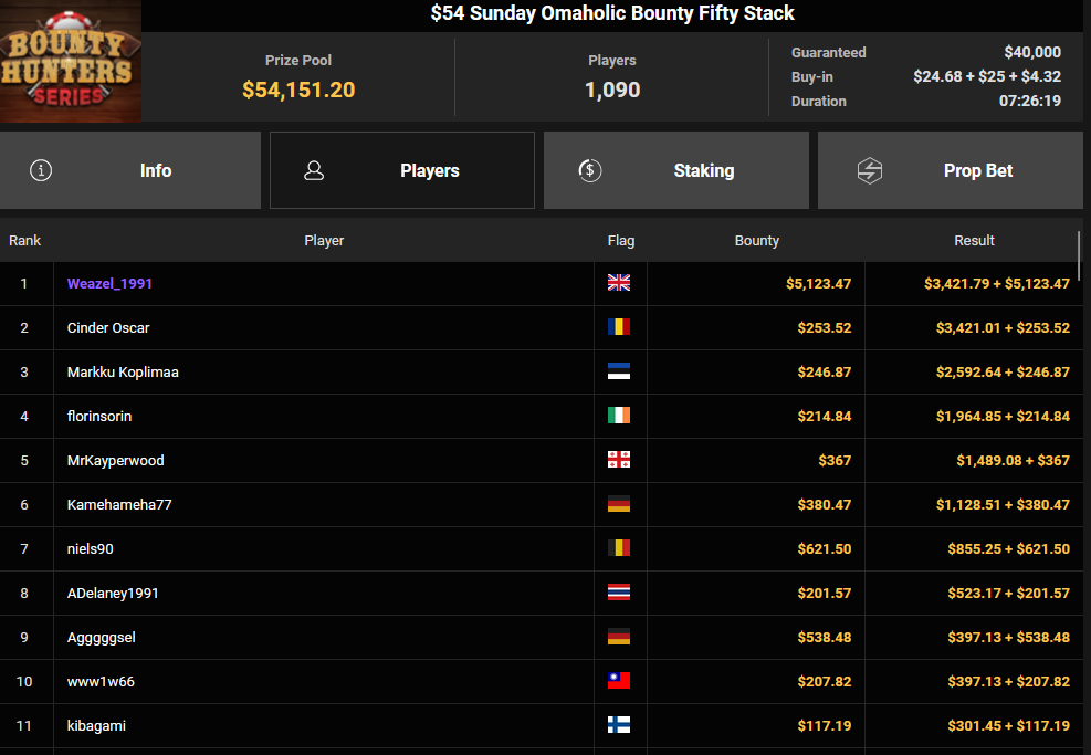 Seyho wurde Runner-up beim $215 Bounty Overload für $1.046 + $19.470, Trey_OG verpasste den Sieg beim $15 Bounty Freezeout ($5.624 + $301). Tobias Schwecht konnte sich beim $1.050 Sunday Omaholic Bounty HR Rang 3 für $5-857 + $1.687 sichern, Sharonnn01 kassierte für Rang 3 beim $108 Sunday Showdown $21.471 + $1.524.