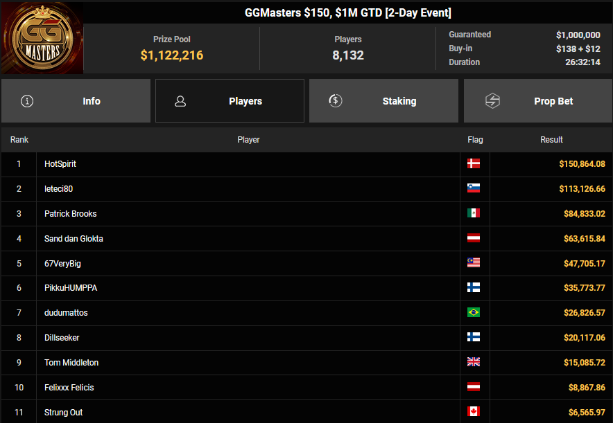 Während die täglichen GGMasters Formate von Montag bis Samstag günstiger sind, locken immer sonntags das zweitägige $150 GGMasters ($1.000.000 GTD), das $1.050 GGMasters HR und das $320 GGMasters Bounty an die Tische. Beim $150 GGMasters kam man mit 8.132 Startern wieder klar über die Garantiesumme, als bester Österreicher verpasste Sand dan Glokta mit Rang 4 ($63.615) das Podest, der Däne „HotSpirit“ holte den Sieg für $150.864.