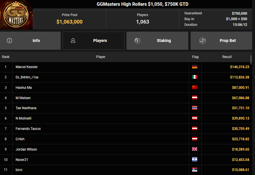 Beim $150 GGMasters HR war es Marcel Kessler, der sich bei 1.063 Startern durchsetzen konnte und den Sieg für $146.318 holte. Auch Felix „Cr4sh“ Rabas war am Final Table (8/$23.718).