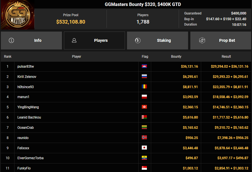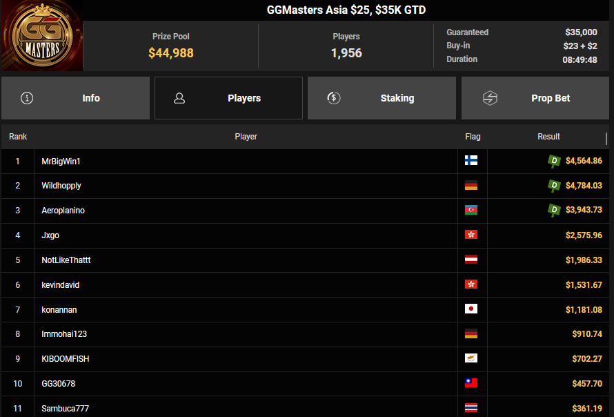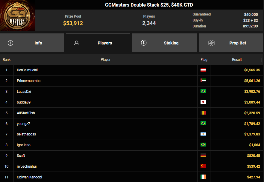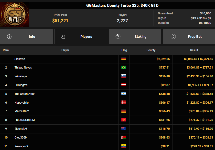 Beim $25 GGMasters Double Stack war es DerOelmuehl, der sich den Sieg für $6.565 sichern konnte. Außerdem schlug Sickovic beim $25 GGMasters Bounty zu und kassierte hier $3.066 + $2.329 für den Sieg. Bl0kingcvll konnte noch $1.935 + $89 für Rang 4 mitnehmen. Beim $25 GGMasters Asia war Wildhopply bei der Teilung der letzten drei beteiligt und kassierte mit $4.784 das meiste Geld für Rang 2.