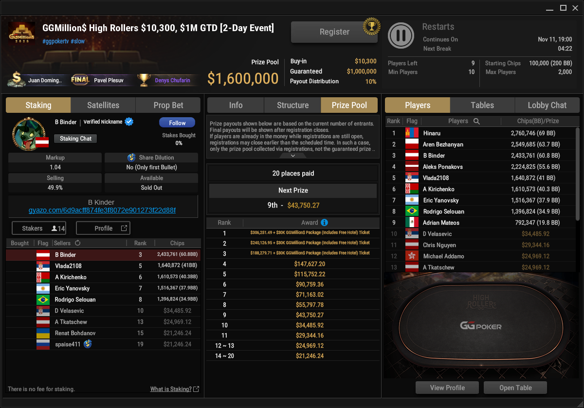 Während alle anderen Day 2s ohne deutschsprachige Beteiligung auskommen, steht Bernhard Binder im Finale beim $10.300 GGMillion$ High Rollers. 160 Entries sorgten diese Woche für $1.600.000 im Pot, die ersten 20 Plätze waren bezahlt. Alex Tkatschew landete auf Rang 13 für $24.969, Chris Nguyen musste sich mit Rang 11 für $29.344 begnügen. Bernhard Binder schaffte es an den Final Table und hat auch bereits $43.750 sicher. Der Sieger kassiert $306.251 + $30k GGMillion$ Package. Die Entscheidung gibt es morgen wie immer auf ggpoker.tv zu sehen.
