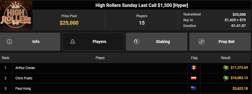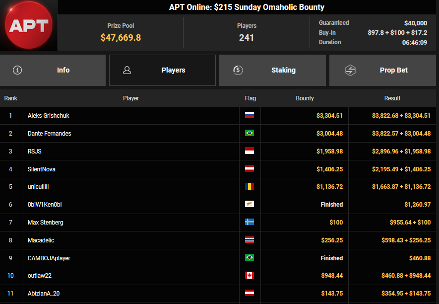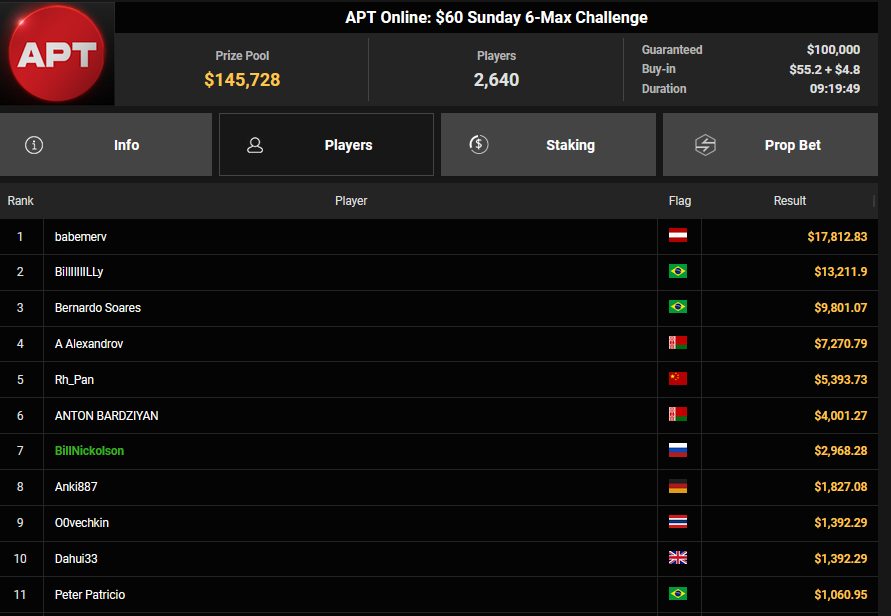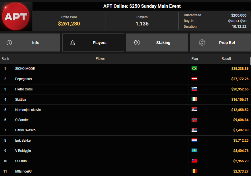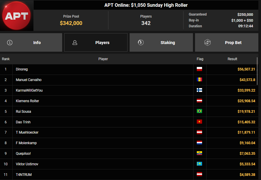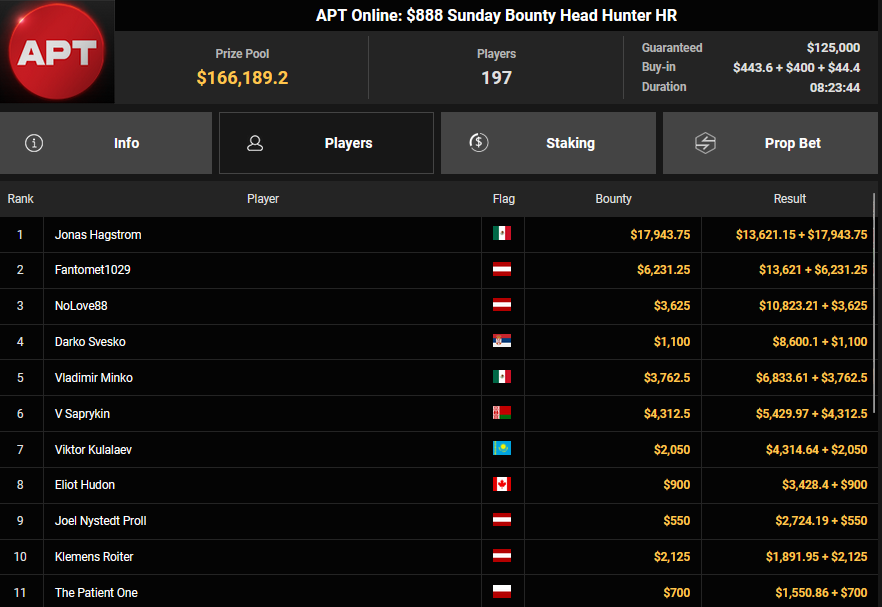Bei den High Rollern sorgte die APT Online auch zusätzlich für Action, Pepegasus startete mit einem zweiten Platz beim $250 APT Sunday Main Event ($27.172), Fantomet1029 wurde beim $888 APT Bounty Head Hunter HR Runner-up für $13.621 + $6.231, NoLove88 kam auf Rang 3 für $10.823 + $3.625. Klemens Roiter verpasste beim $1.050 Sunday High Roller das Podest (4/$25.908).
