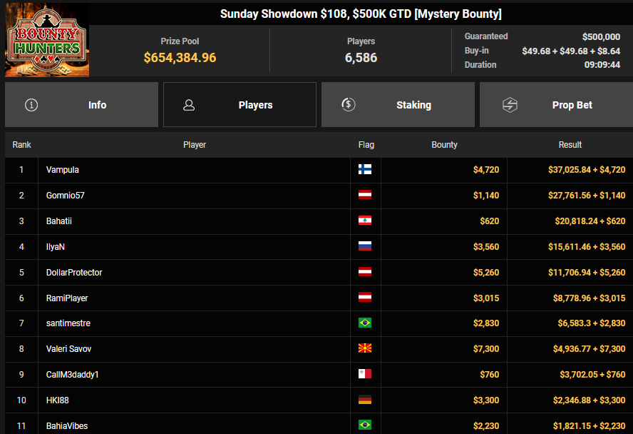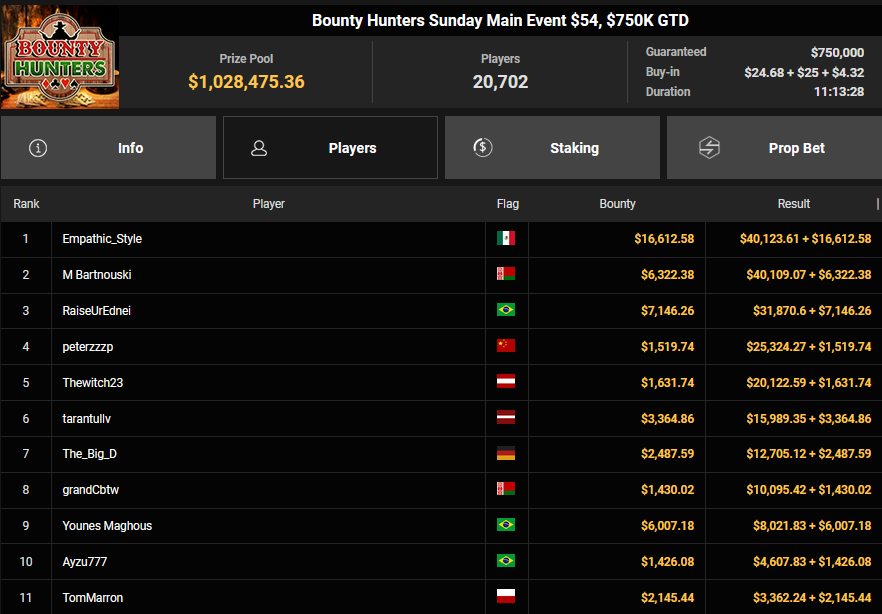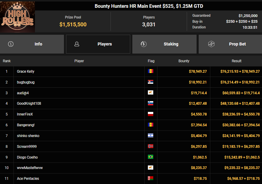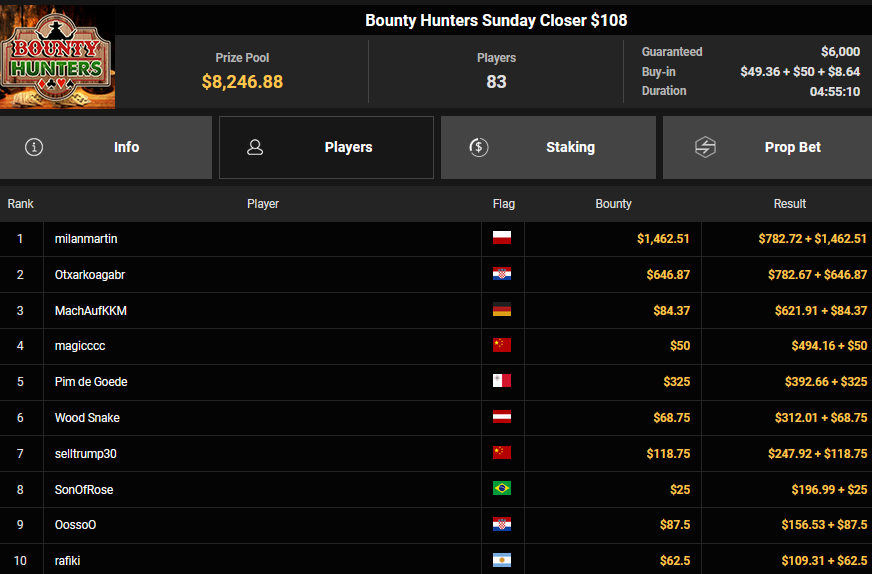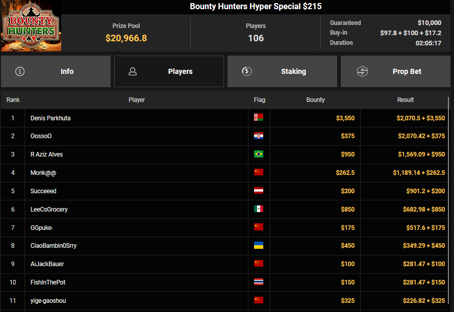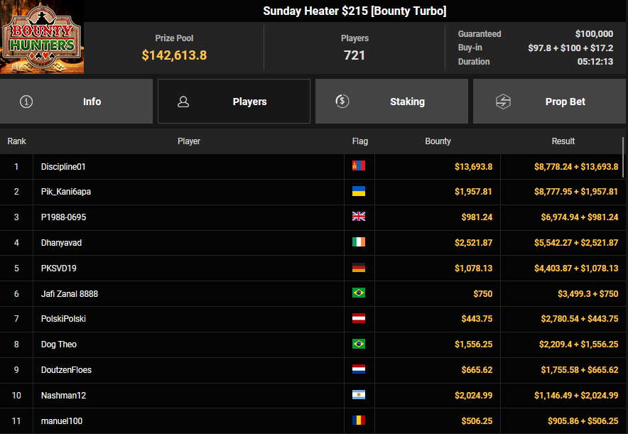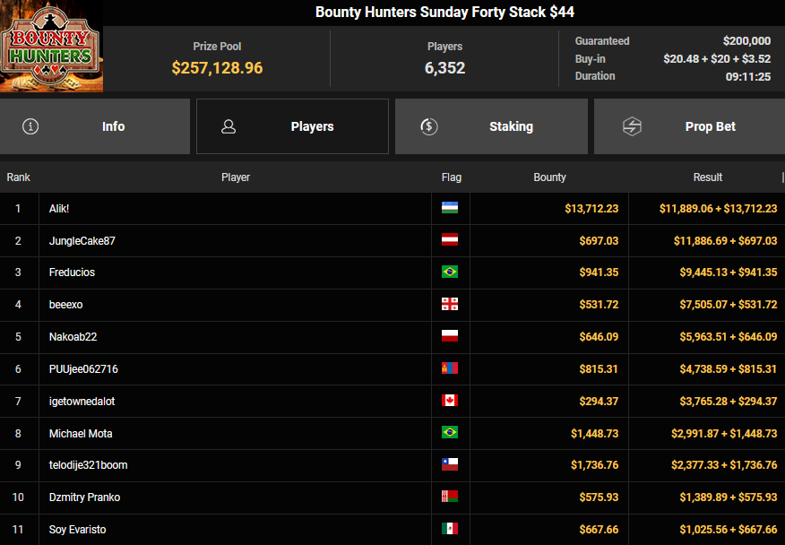 EagleAye kassierte $7.543 + $1.958 für Rang 3 beim $54 Bounty Builder Asia, FrydaDeuGoat wurde Dritter beim $150 Sunday Mega Bounty ($4.529 + $368). babemerv siegte beim $60 Sunday 6-max Challenge für $17.812, QZRepublic belegte beim $150 Bounty Hunters Rang 3 für $2.712 + $1.087.