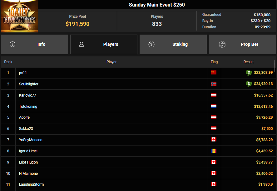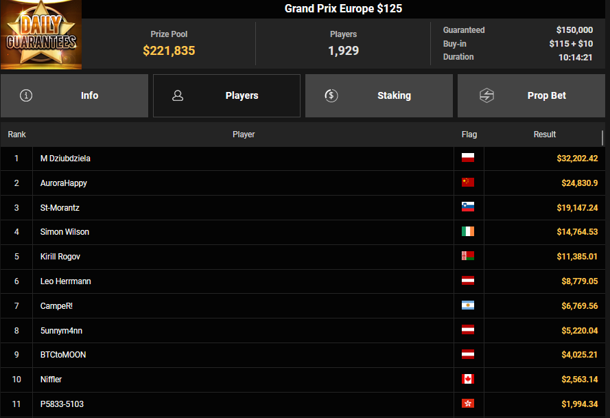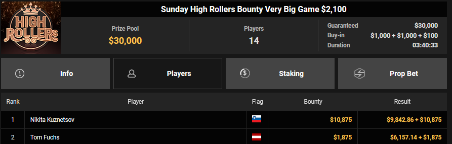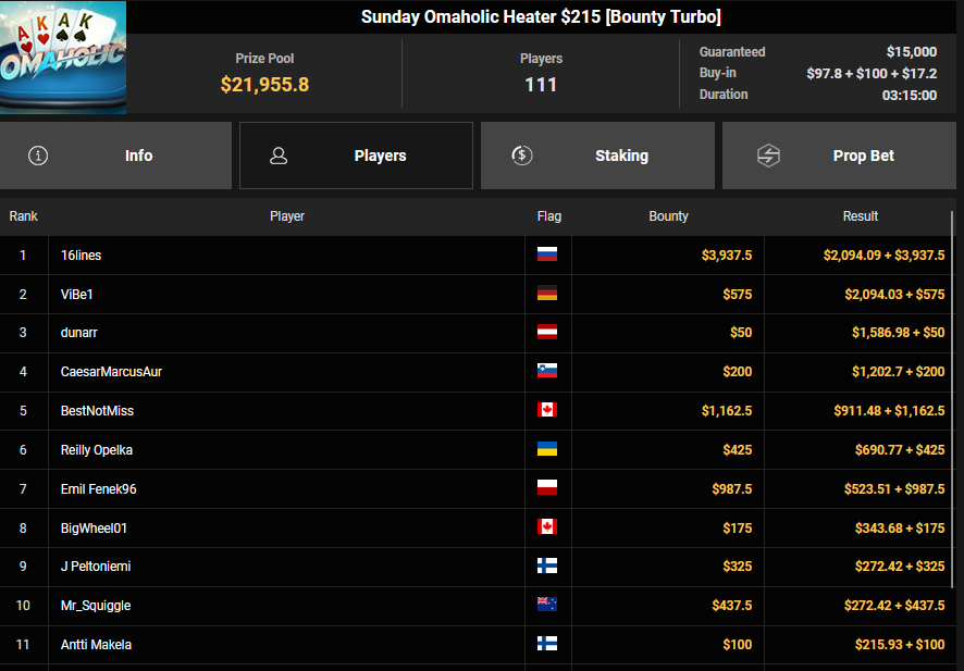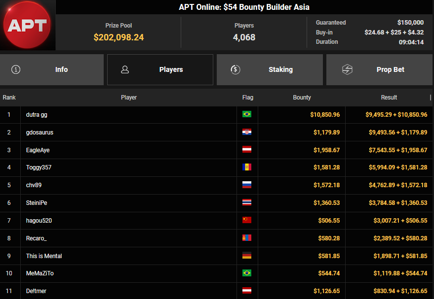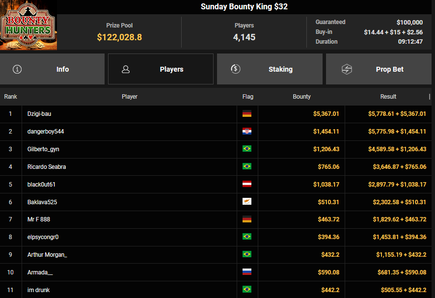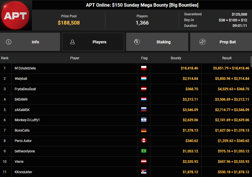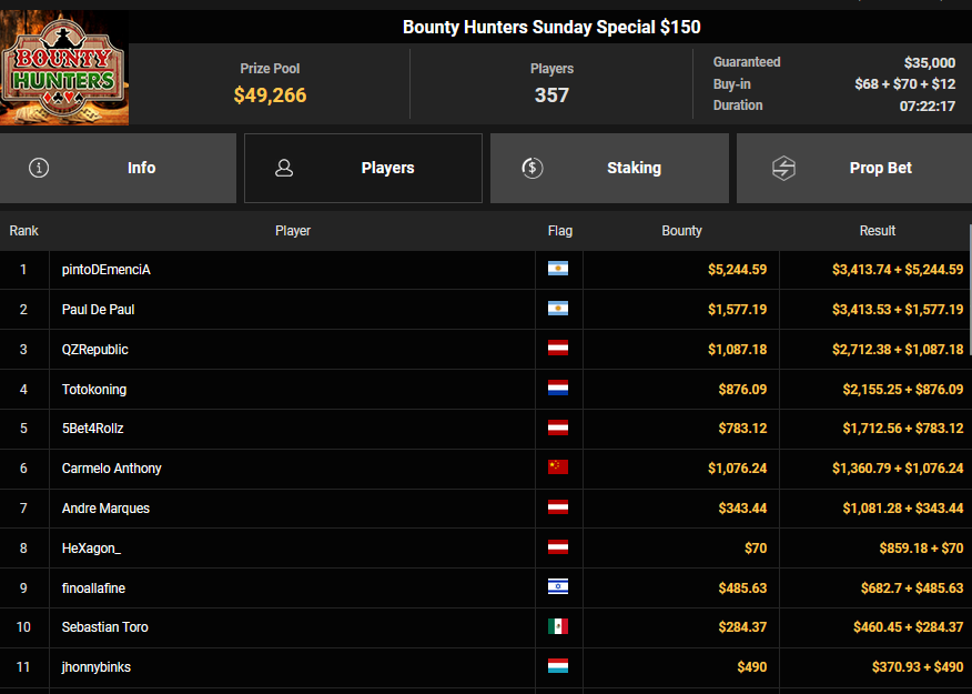 EagleAye kassierte $7.543 + $1.958 für Rang 3 beim $54 Bounty Builder Asia, FrydaDeuGoat wurde Dritter beim $150 Sunday Mega Bounty ($4.529 + $368). babemerv siegte beim $60 Sunday 6-max Challenge für $17.812, QZRepublic belegte beim $150 Bounty Hunters Rang 3 für $2.712 + $1.087.