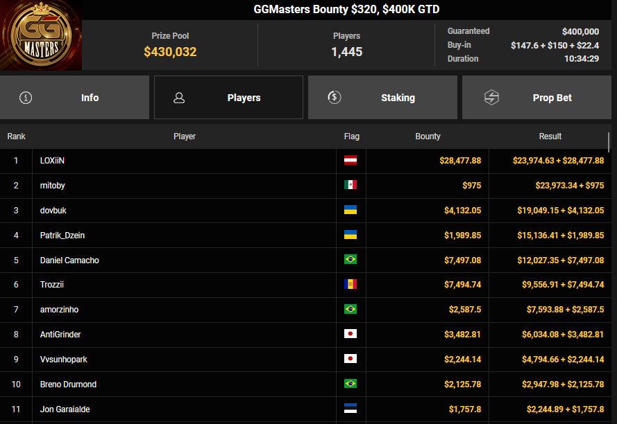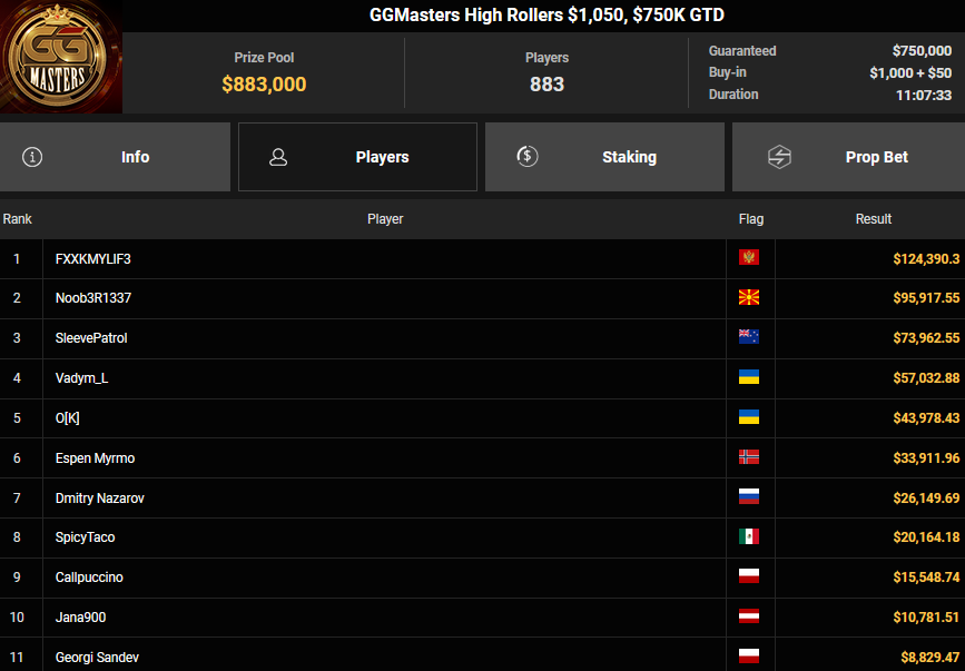 Karlovic77 eroberte beim $250 Sunday Main Event Rang 3 für $16.357, LOXiiN holte den Sieg beim $320 GGMasters Bounty für $23.974 + $28.477. ViBe1 wurde beim $215 Sunday Omaholic Runner-up für $2.094 + $575, dunarr nahm noch $1.586 + $50 für Rang 3 mit.