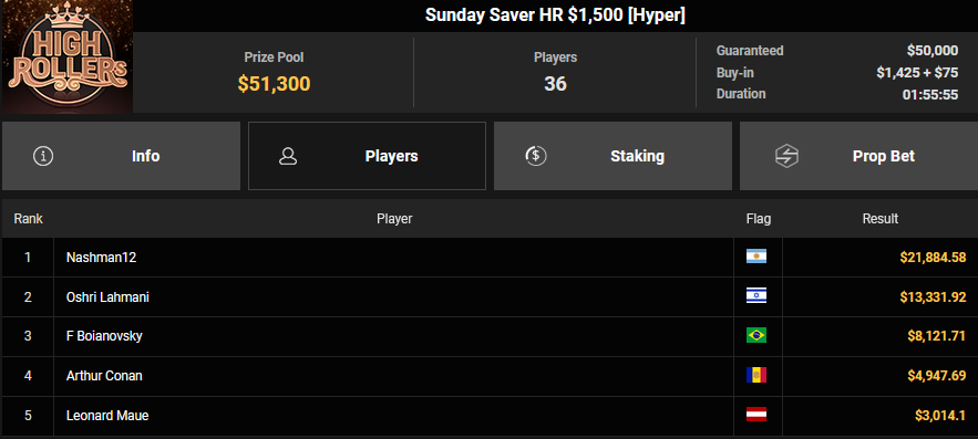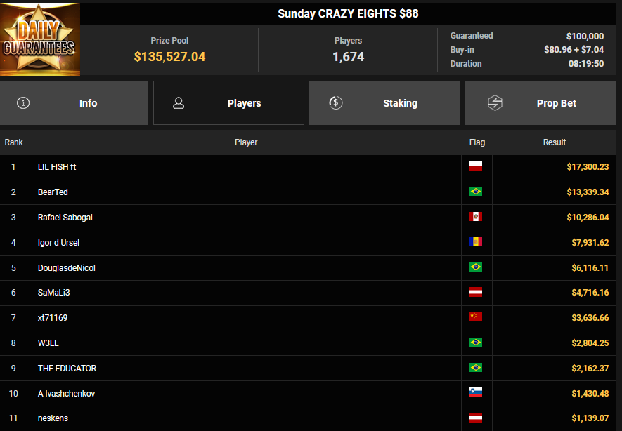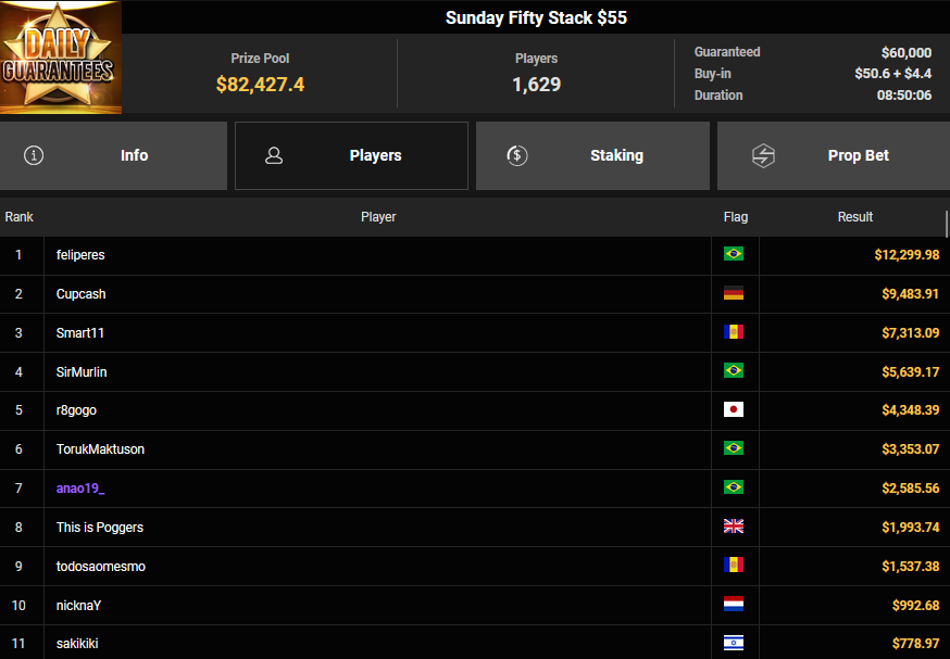 JungleCake87 verpasste den Sieg beim $44 Forty Stack ($11.886 + $697), auch Cupcash wurde Runner-up beim $55 Sunday Fifty Stack ($9.483). Dzigi-bau konnte sich dafür das $32 Bounty King für $5.778 + $5.367 sichern, Gomnio57 wurde Runner-up beim $108 Sunday Showdown ($27.761 + $1.140. MachAufKKM belegte beim $108 Sunday Closer Rang 3 für $621 + $84.