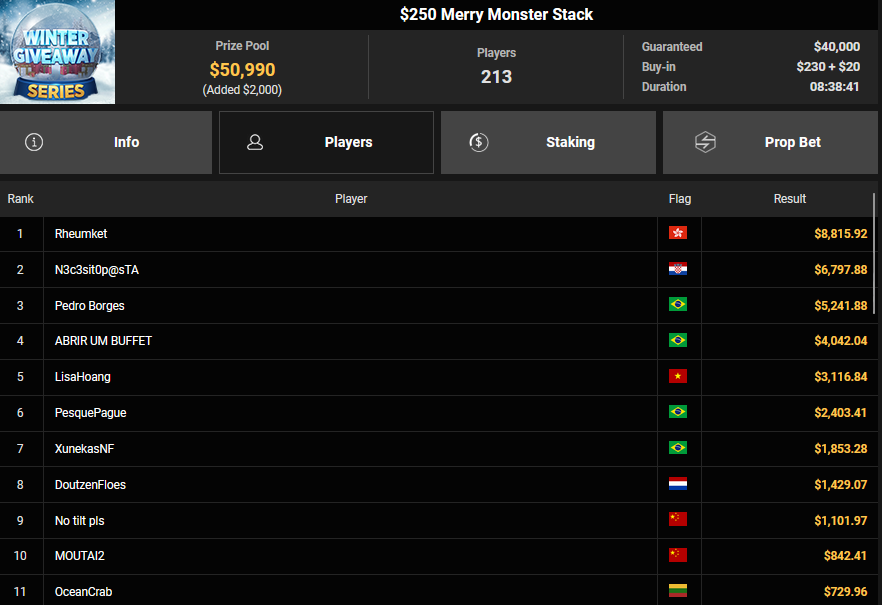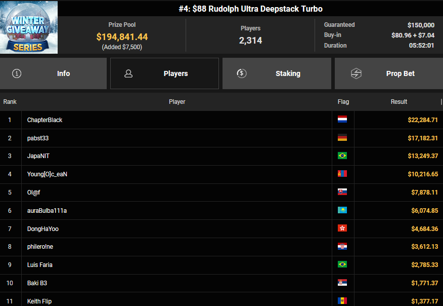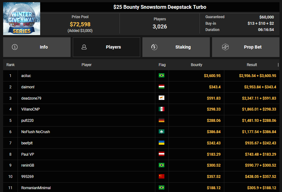 mcaflix7 konnte für Rang 3 beim $215 Bounty Hunter Winter Games $6.596 + $3.-872 mitnehmen, nailuj90 belegte Rang 4 für $5.241 + $1.652. pabst33 kassierte für Rang 2 beim $88rudolph Ultra Deepstack Turbo $17.182.