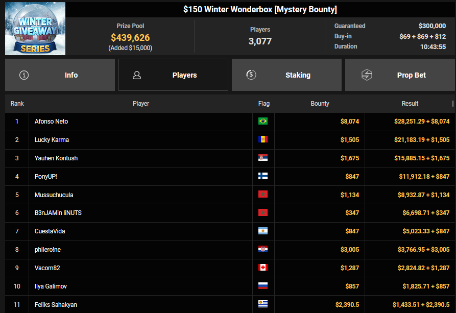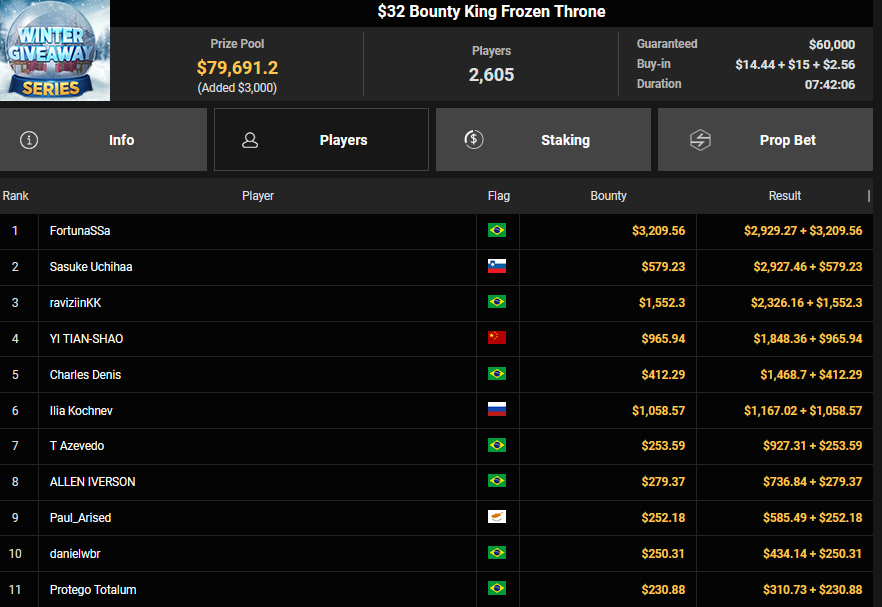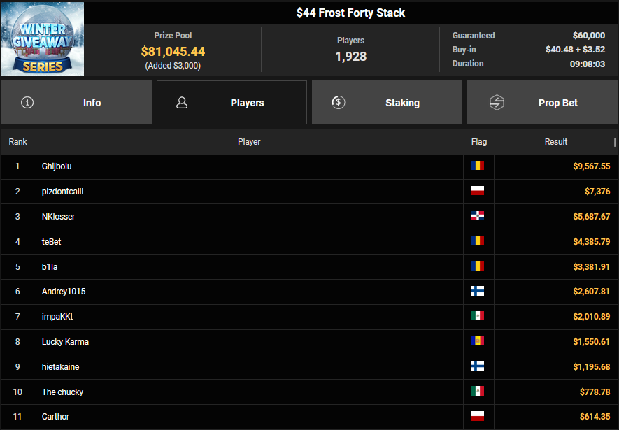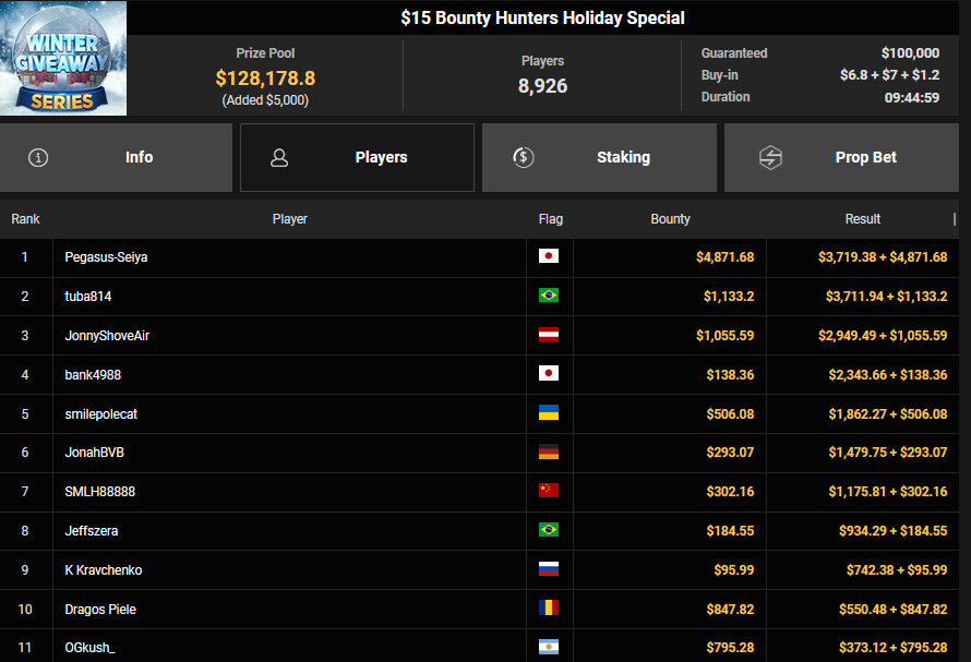 ScatmaN44 wurde Dritter beim $150 Bounty Blastoff ($2.169 + $1.125), JonnyShoveAir wurde ebenfalls Dritter beim $15 Bounty Hunters Holiday Special ($2.949 + $1.055). GarneLaros wurde beim $88 Runner-up für $8.106, Berlenda verpasste den Sieg beim $250 Daily Winter Freezeout ($9.238).